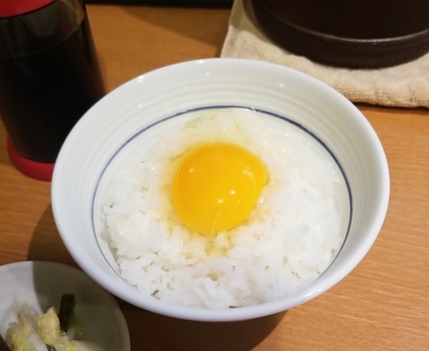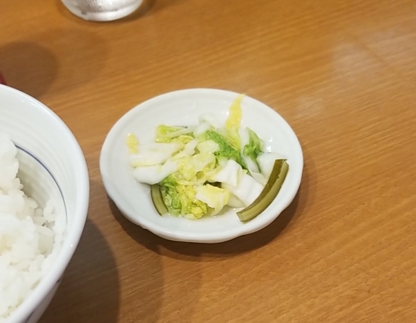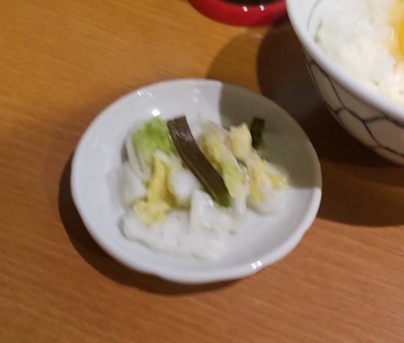 卵かけご飯には白菜の浅漬がつき、醤油の量は少しだけその方が卵の味がしっかりと感じられて美味しいですね。