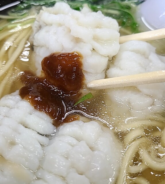 鱧(塩味)です。もちろん鱧増しです。この日がラストの提供日でした。注文があってから鱧の骨切りです。骨が切れる音がちゃんと聞こえます。スープは鱧を湯引きした出汁を使って、マツタケが脇役で入るなんとも贅沢な塩スープ、麺は自家製の中太麺、鱧伸びて旨味にマツタケの風味のきいたスープが良く絡んで美味しいです。水菜の食感も良く、梅肉の乗った鱧、ふわふわですが、歯ごたえも良く、しっかり骨切りされてるので食べやすく、これはかなり美味しいです。ちょこっとマツタケも入ってますね。
