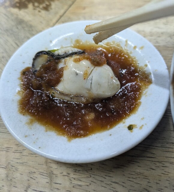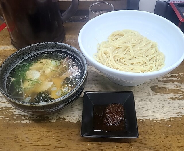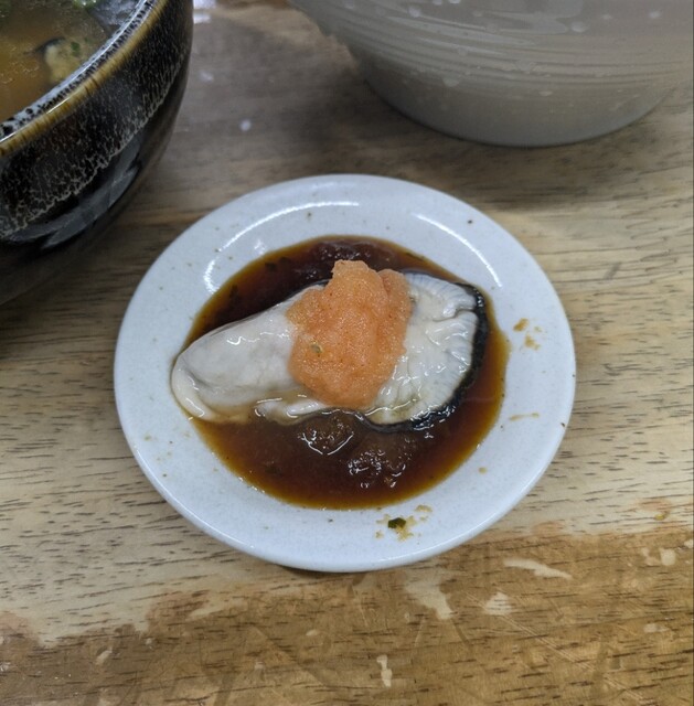 毎週火曜日の夜限定つけ麺メニューこの日も火曜日の夜です。時間も夜6時半です。店内は結構な賑わいです。今年麺哲でに最初の一杯は?火曜日夜限定献立、サムライオイスターです。麺はもちろん麺哲自慢の自家製麺の中細麺、今回も200グラム、スープは鶏に鰹節、鯖節、宗田節、昆布を合わせた塩清湯スープ、サムライオイスター、播州赤穂産のブランド牡蠣を合わせて、別皿で生牡蠣の紅葉おろしポン酢、牡蠣エキスの旨味のしっかり美味しいスープ、自家製の中細麺、スープを潜らせて頂いて、塩清湯スープが良く絡んで美味しいです。ネギにメンマの食感も良く、ワカメ風味が、これ又美味しいです。厚切り焼豚肉々しく歯ごたえ良くこれ又美味しいです。生牡蠣は紅葉おろしポン酢でプリプリ、ミルキーでこれ又美味しいです。3個入った赤穂産牡蠣、プリプリでジューシーこれ又美味しいです。さらに紅葉おろしポン酢に浸けてこれ又美味しいです。最後はもちろんスープ割、塩身も程よくこれ又美味しいです。麺哲の火曜日限定の美味しい一杯でした。