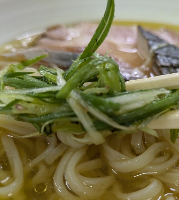 今回は?火曜日夜限定、裏つけ麺、鰆です。麺は自家製の縮れた中太麺、何と麺が変わりましたね。風味に歯ごたえ良く、縮れが程よい美味しい麺、スープは鶏に鰹節、鯖節、宗田節等に昆布合わせた塩清湯スープ、塩身もキリッと美味しいスープ、自家製の縮れた中太麺、縮れでスープが良く絡んで美味しいですね。九条ネギの食感良く、メンマもコリコリです。
