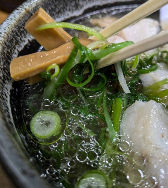 国産ブランド鶏と鰹節、鯖節、昆布等の魚介を合わせた、塩清湯スープに広島産牡蠣の出汁を合わせたスープ、牡蠣の旨味がしっかり、美味しいスープです。