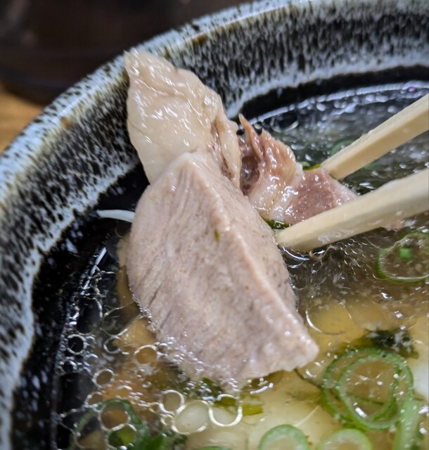 阪急豊中駅降りてちょいと歩いたところですね?時間もオープン直後の時間も午後6時です。もうすでにお客さんが数名いますね。ここも券売機になったので食券を買って中に。今回は?火曜日夜営業の限定?裏つけ麺です。今回は?明石産瘤鯛です。麺は自家製の細麺、200gで頂いて?スープは鶏に魚介の節系に昆布を合わせた塩清湯スープ。塩味もキリッと美味しいスープです。とろろ昆布の旨味もきいてますね。自家製の細麺、塩清湯スープに潜らせて?瘤鯛の旨味も合わさったスープが良く絡んで美味しいです。青ネギの食感も良く、メンマもコリコリ美味しいです。厚切り肉、肉肉しく歯ごたえ良くこれ又美味しいです。塩スープで煮込まれた瘤鯛の切り身、そのままでも旨味しっかり身もプリプリ美味しいですね。おろしポン酢に潜らせてこれ又美味しいです。麺の上の瘤鯛の刺身、先ずはおろしポン酢で頂いて、プリプリ美味しいです。次は塩清湯スープでしゃぶしゃぶさせて?おろしポン酢で頂いて、さらにプリプリこれ又美味しいです。最後はもちろんスープ割です。程よい濃さに、とろろ昆布の旨味も引き立つ美味しいスープですね。高級魚を使った美味しい一杯でした。