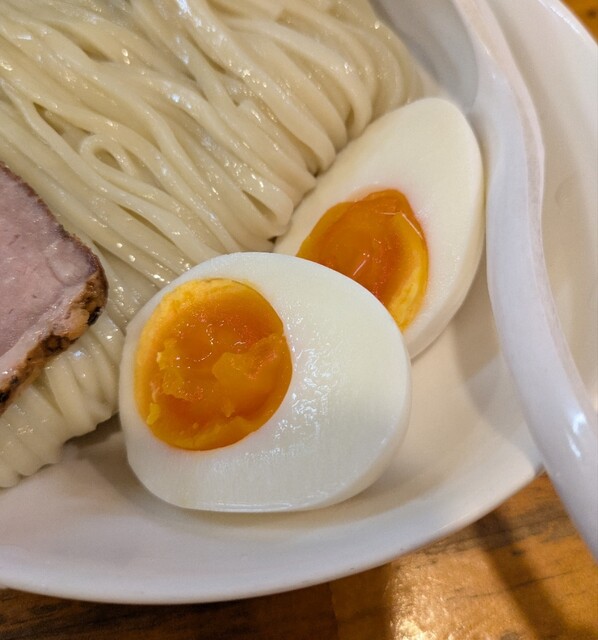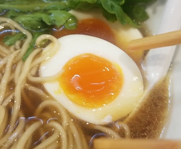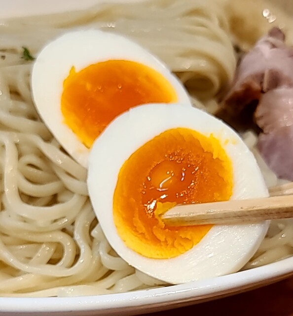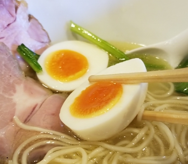 トッピングした放牧鶏の煮玉子、程よい味付け、冷たいスープに潜らせてもこれ又美味しい。