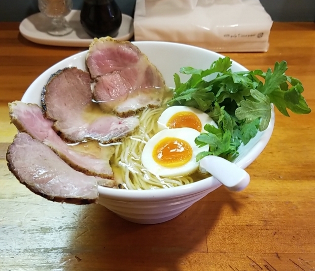 時間も午前11時半、オープンしてしばらくなので行列かなぁと思いましたが?やっぱり行列でした。最後尾に並んで待つことに、約15分程で店内に、今回は?久々レギュラーメニュー、地鶏魚貝塩です。放牧鶏の煮玉子もトッピング、一緒に?名物わさびめしも頂いて。地鶏清湯スープに魚介を合わせた、あっさりですが深い味わいの美味しいスープ。自家製の細麺にあっさり塩清湯スープが良く絡んで美味しいですね。三つ葉の風味も良く、揚げネギ、香ばしく美味しいです。放牧鶏の煮玉子、黄身とろとろ、これ又美味しいです。炭火焼きチャーシュー、香ばしく軟らかく肉肉しくこれ又美味しいです。名物わさびめしは最初は醤油垂らして、ツンッと来ますね。最後は地鶏魚貝塩スープかけて〆ごはんです。わさびが程よくきいて、ごはんが進む美味しいです。洗練されたスープにわさびのきいた美味しい一杯でした。