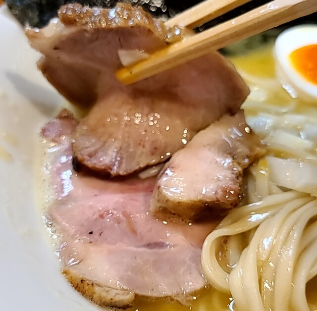 放牧鶏の煮玉子も程よい味付、美味しいです。炭火焼きチャーシュー、肉肉しく歯ごたえ良く、香ばしく美味しいですね。