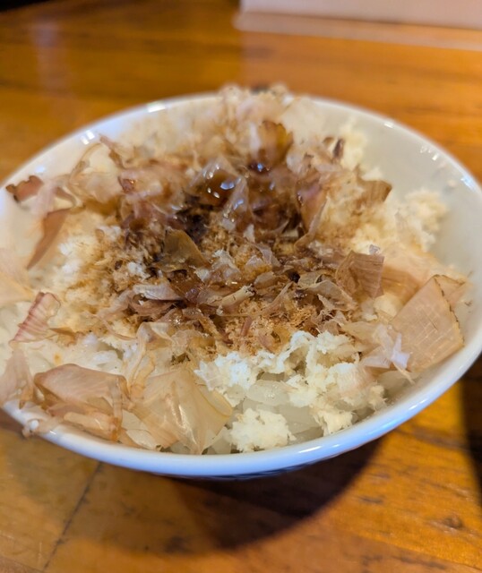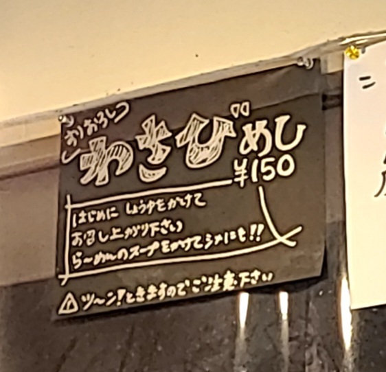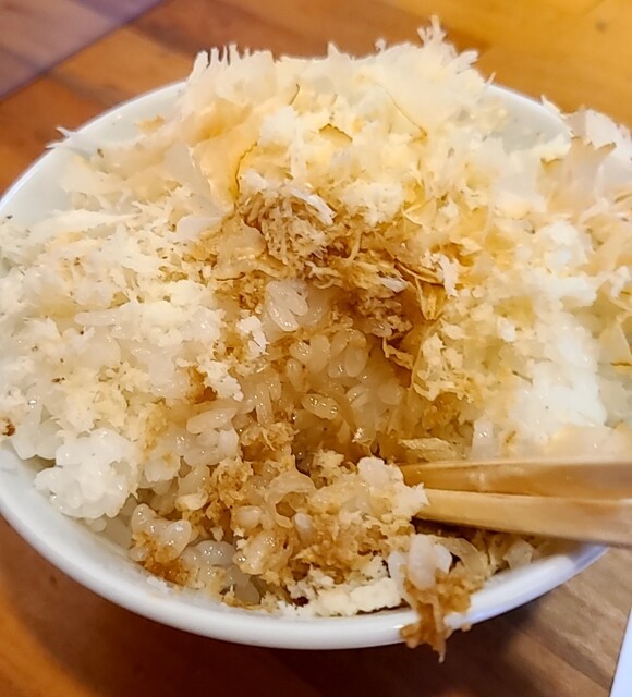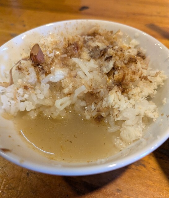 一緒に名物‼️わさびめし、最初はそのまま、次は醤油をかけて、美味しい‼️最後は地鶏白湯スープとタマネギも入れて、ホースラディッシュが程よくマイルドに‼️限定麺とわさびめし、最後まで美味しい一杯でした‼️