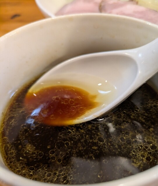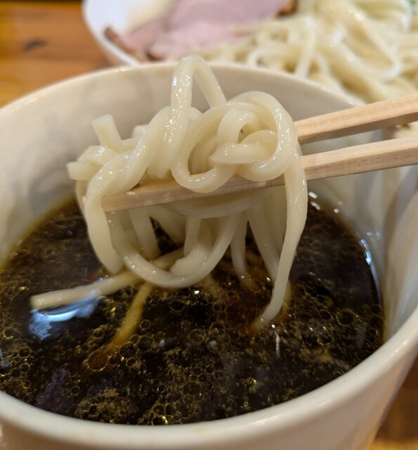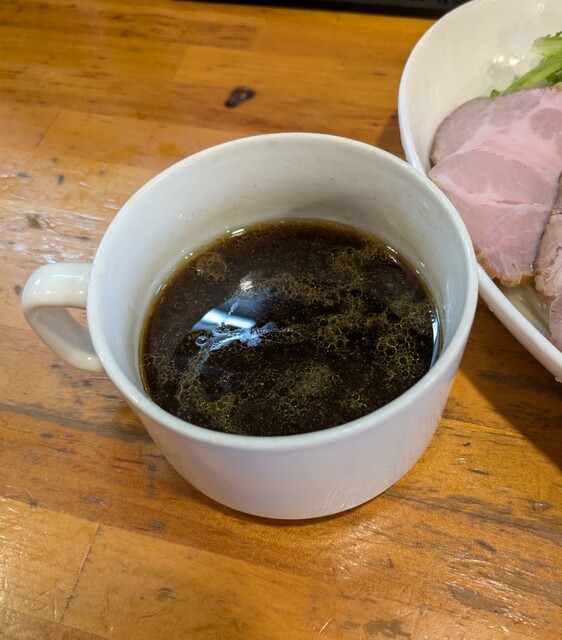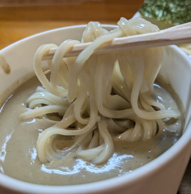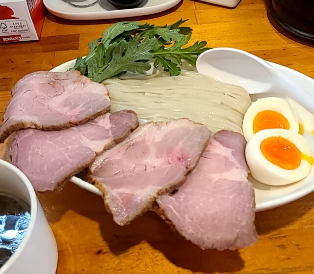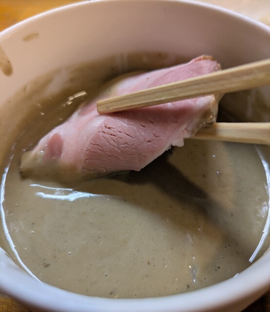 東大阪は河内小阪です、時間も11時ちょい前です、何とポールポジションです。オープンして店内に。何とこんな事初めてですが、でもその後はどんどんお客さん、行列まで出来るのに10分かかりませんでした。10分遅れたら、並ぶ羽目になってたでしょうね。今回は?限定、冷やしクリーミー煮干しつけ麺です。放牧鶏の煮玉子もトッピングです。麺は自家製の平打ち中太麺、200gで頂いて、水でしっとり〆られて、腰の強い美味しい麺、スープは冷たいクリーミーなヴィシソワーズスープ、煮干し旨味に苦味も残したくせのあるタイプですが、それが美味しいです。冷たいスープに潜らせて、ドロドロスープ良く絡んで美味しにですね。大葉投入、風味良くさっぱり美味しいです。海苔で麺くるんでこれ又美味しいです。放牧鶏の煮玉子も控えめな味付、黄身とろとろ美味しいですね。炭火焼きチャーシュー2枚、香ばしく肉々しくこれ又美味しい、冷たい煮干しスープに潜らせても又々美味しいです。スープ割は無いので冷たいスープそのまま頂いて、ガッツリ煮干しの冷たい美味しい一杯でした。