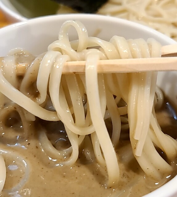 自家製の極太麺です。程よいかみごたえにゆでられて、濃厚背脂煮干しスープが良く絡んで美味しいですね。