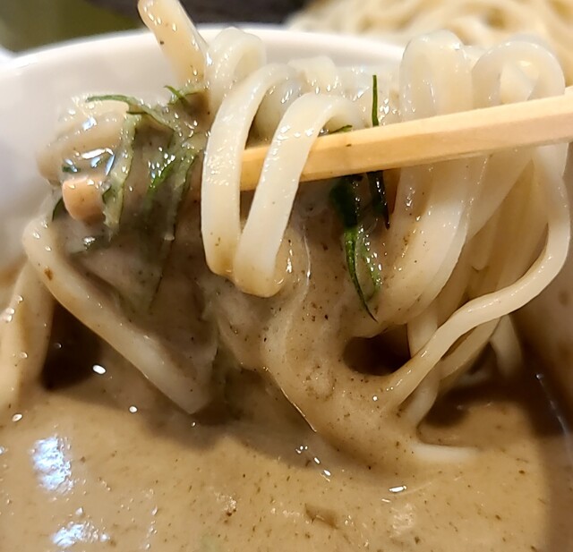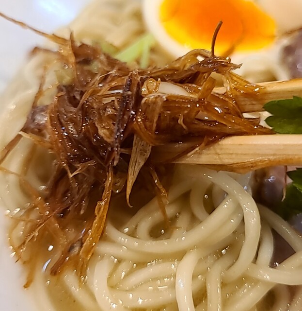 麺に添えてある大葉もスープに投入、大葉の爽やかな風味がガッツリ冷たい魚介スープと良く合って美味しいですね。