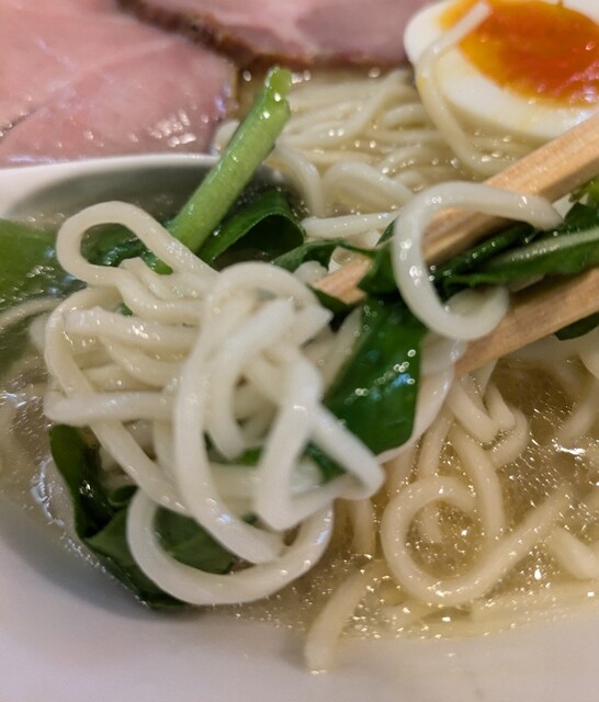 自家製の細麺、地鶏と魚貝のあっさりスープが良く絡んで美味しいです‼️