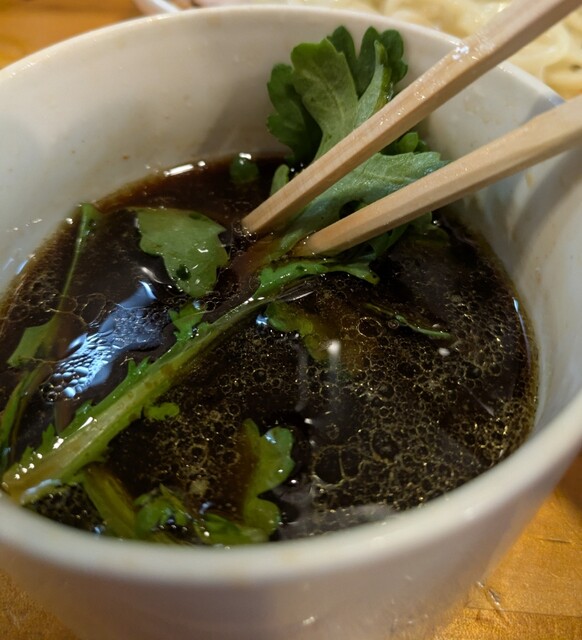 お休みの日です。東大阪は河内小阪です。時間も午前11時ちょい過ぎです。すでにオープン、何と行列無し、カウンター1席空いててすぐに座れました。こんな珍しいです。今回は?限定。地鶏醤油つけ麺です。放牧鶏の煮玉子もトッピングです。スープは地鶏から取られた濃い目の醤油清湯スープ、表面には多めの鶏油、油で膜を張った感じになって、スープ熱々です。地鶏の旨味に濃い目の醤油味、美味しいスープです。麺は自家製の平打ち中太麺、200gで頂いて。腰の強いツルツル美味しい麺。地鶏醤油スープに潜らせて、スープが良く絡んで美味しいですね。春菊も地鶏醤油スープに浸けといて、麺と一緒に、春菊のほんのり苦味がアクセントにこれ又美味しいです。放牧鶏の煮玉子、黄身も程よく味付もちょうど良く美味しいです。炭火焼チャーシューは炭火で香ばしく肉々しく歯ごたえ良く、旨味しっかり美味しいです。麺を食べ終えると、もちろんスープ割。キノコ出汁のスープで割って、ちょうど良い濃さに。地鶏の旨味にキノコの旨味又々美味しいです。地鶏の旨味しっかりの美味しい一杯でした。