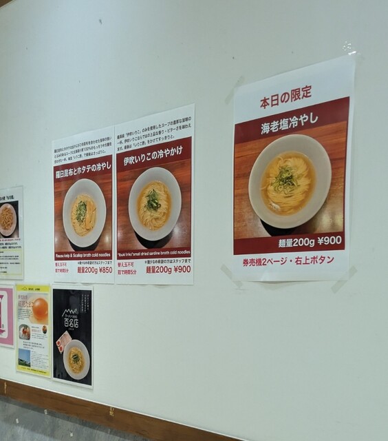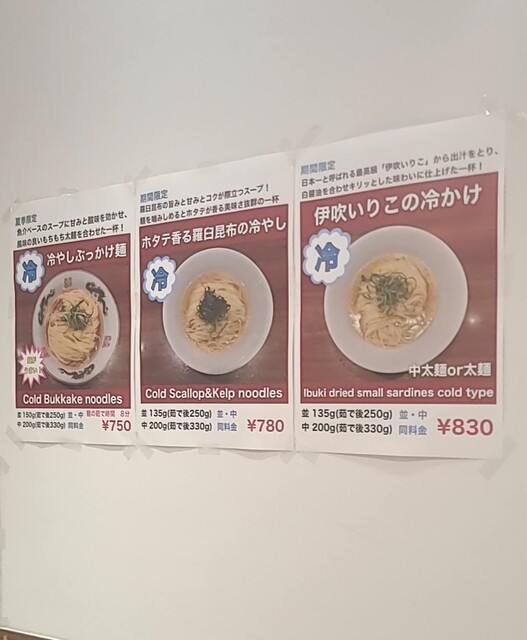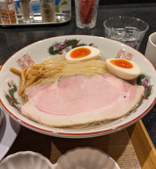 平日のお昼ご飯です。時間も12時ちょい前です。店内はすでに賑わいです。券売機で食券買って。この日はレギュラーメニューはお休みで、冷やしメニューのみの営業のようですが?今回は?限定、海老塩冷やしです。味玉に岩中豚チャーシュー50gもトッピング、特製です。スープは海老のみです煮出された、海老塩清湯スープ。冷たく冷やされて。表面には海老油でしょうか?海老の香り引き立ち海老の旨味甘味も感じる冷たい美味しいスープ。麺は平打ちの中太麺、水でしっかり〆られて、もちもち食感の美味しい麺、冷たい海老塩清湯スープが良く絡んで冷たく美味しいです。青ネギの食感も良く。トッピングした味玉、程よい味付美味しいですね。岩中豚のレアチャーシュー4枚50g、肉々しく歯ごたえ良く、旨味しっかり、冷たい海老塩スープとも良く合ってこれ又美味しいです。海老香り冷たい美味しい一杯でした。