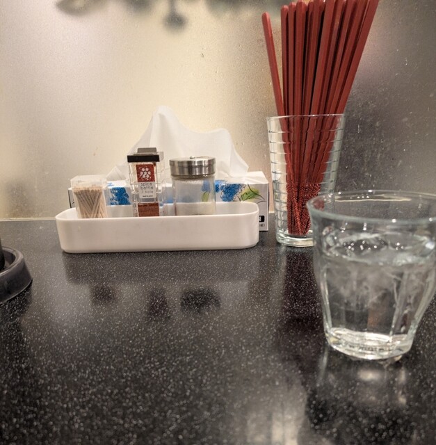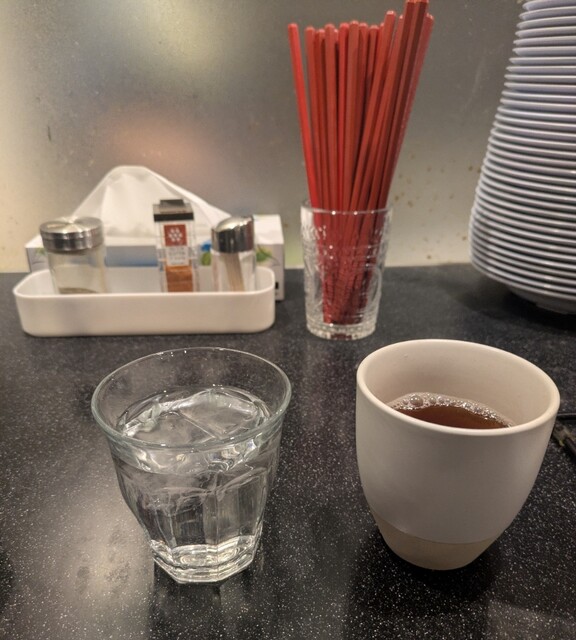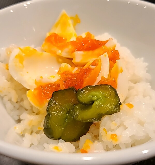 週末のお昼ごはんです。土曜日はお昼営業のみ、時間も午後2時前です。店内は結構なお客さんです。メニューもレギュラーメニューから夏の冷やしメニューと豊富ですね。今回は?限定。海老塩冷やし。味玉トッピング、味玉ごはんも一緒に頂いて。冷たい海老スープ、清んでいるのに海老の旨味がガッツリ、塩味も程よく冷たく美味しいスープですね。平打ち中細麺、水でしっかり〆られて、海老ふうの冷たいスープが良く絡んで美味しいです。トッピング無しなら青ネギのみ、青ネギの食感も良いですね。トッピングした味玉、黄身も程よく味付けもちょうど良く美味しいですね。味玉ごはん、ごはんに味玉が乗っただけですが?崩して、TKG用醤油かけて、味付けしてる味玉でごはんが進む美味しいです。キュウリの漬物が程よい箸休め。ガッツリ海老の冷たい美味しい一杯でした。