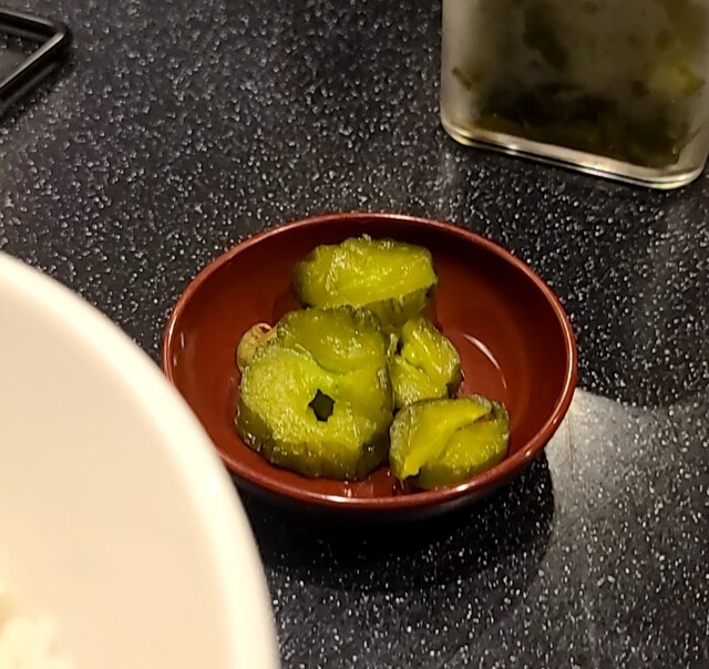 最後はキュウリの漬物とほうじ茶で〆て。