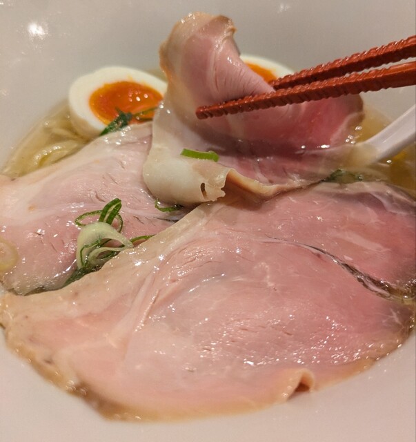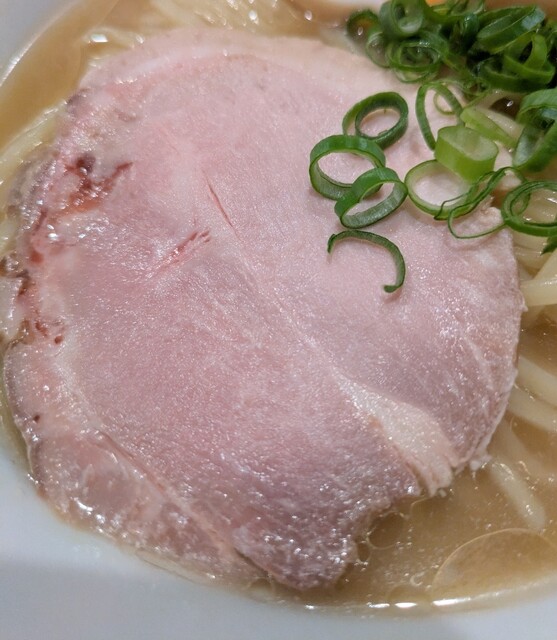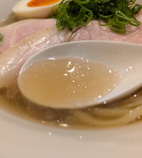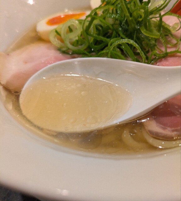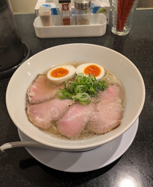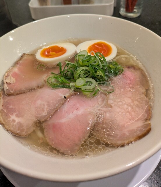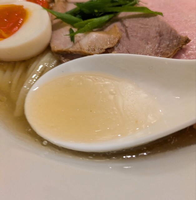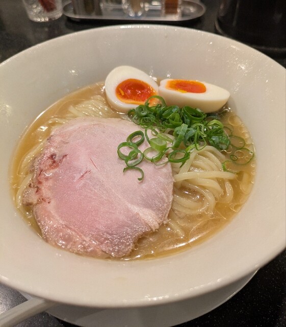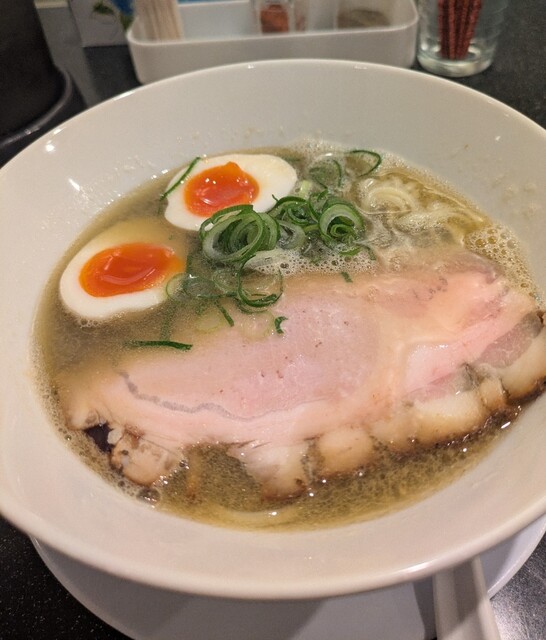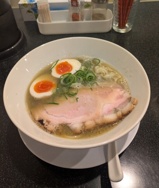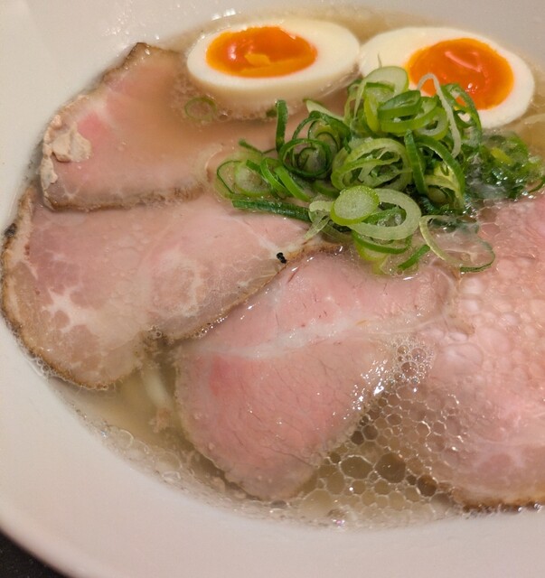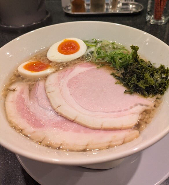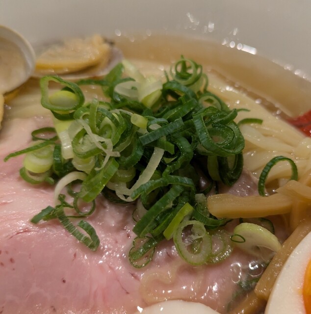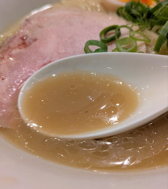 平日のランチタイムです。地下鉄四ツ橋駅直結のビル地下1階です。ちょい早め11時40分到着です。店内はこの時間でも先客数名、その後もどんどんお客さんです。 今回は?ここの売りの1品。特製貝塩らぁ麺です。 スープははまぐりに帆立を炊き上げた貝出汁スープ、牡蠣煮干しを合わせた塩タレを合わせて、貝の旨味しっかりの美味しいスープ。麺は平打ちの中太麺、もっちり食感の美味しい麺、貝出汁スープが良く絡んで美味しいです。 青ネギの食感良く。特製の味玉、黄身とろとろ味付もちょうど良く美味しいです。 特製で4枚入ったレアチャーシュー、脂身の無いチャーシューは肉々しく歯ごたえ良く美味しいです。脂身の多いチャーシューも脂身ジューシー、柔らかく美味しいですね。 貝の旨味しっかりの美味しい一杯でした。