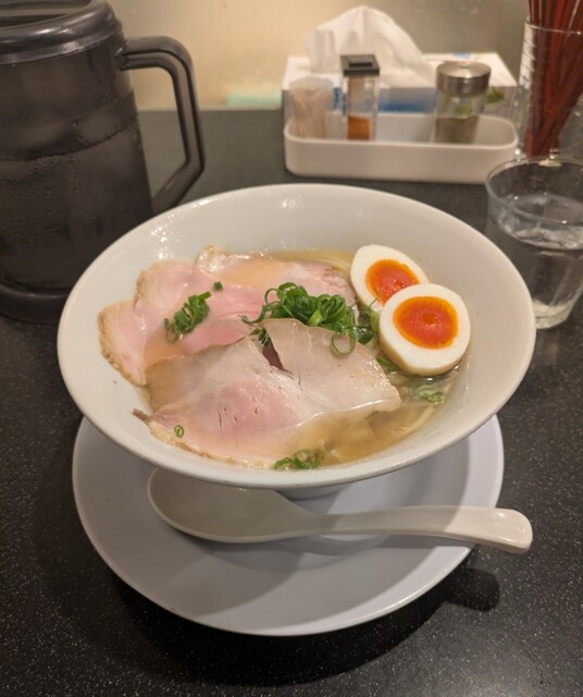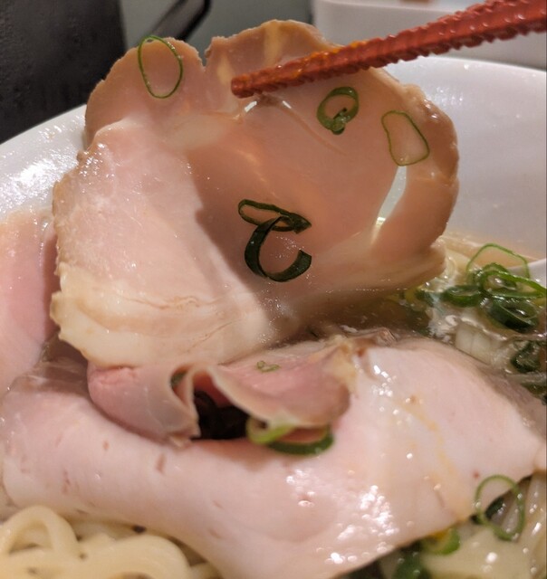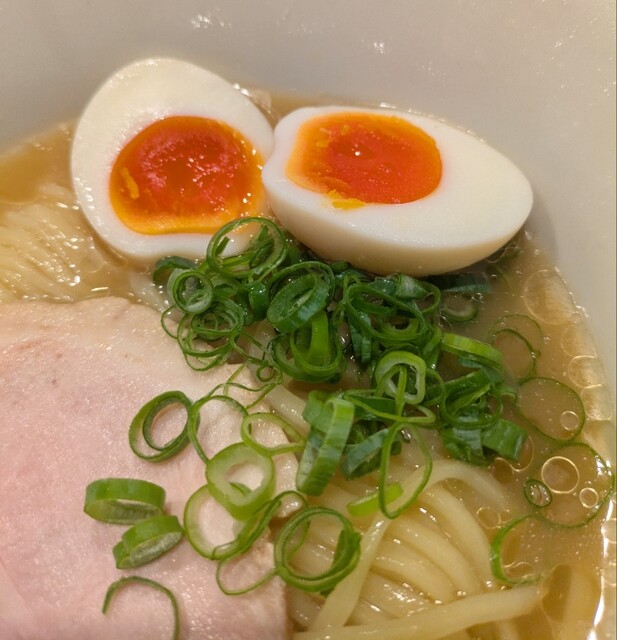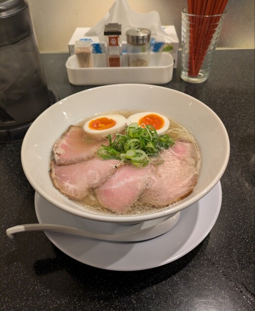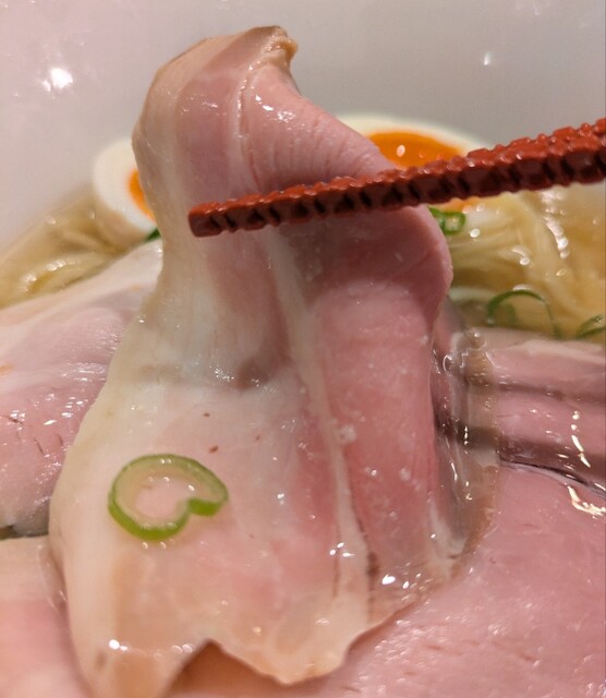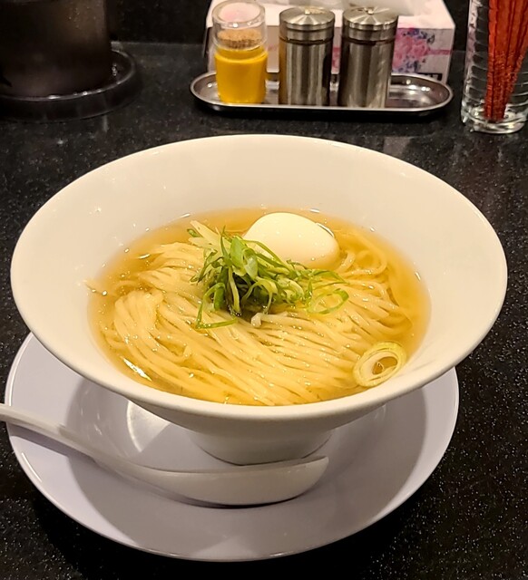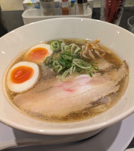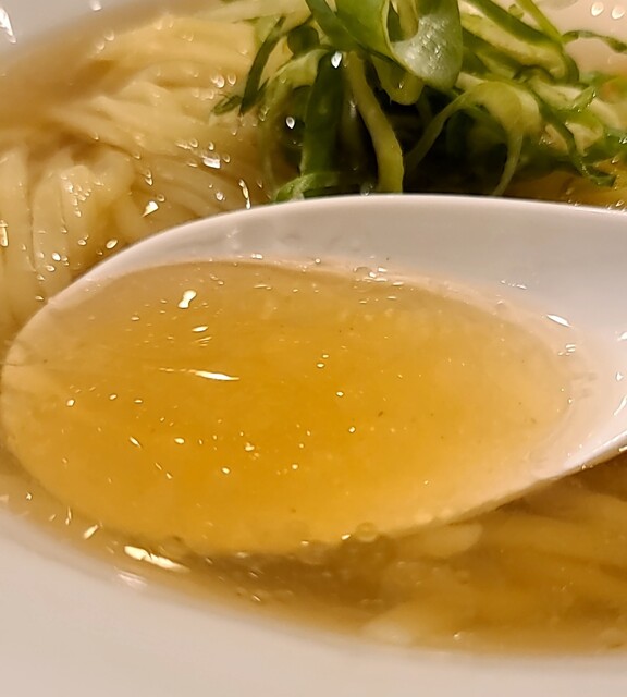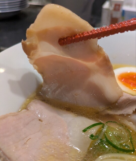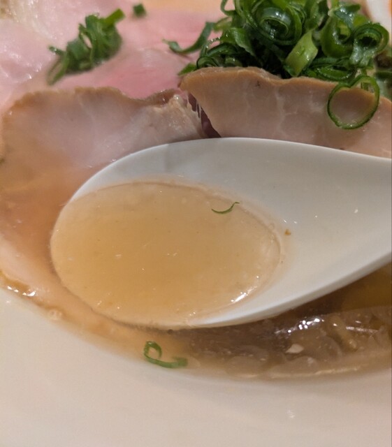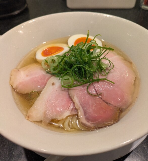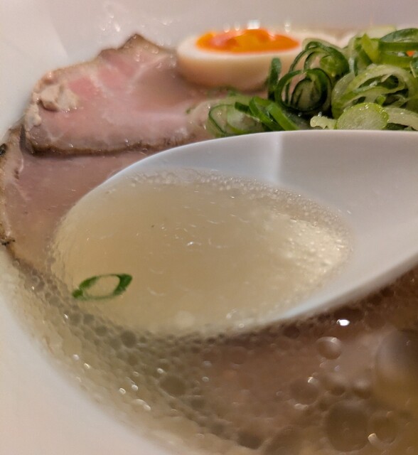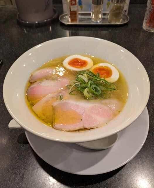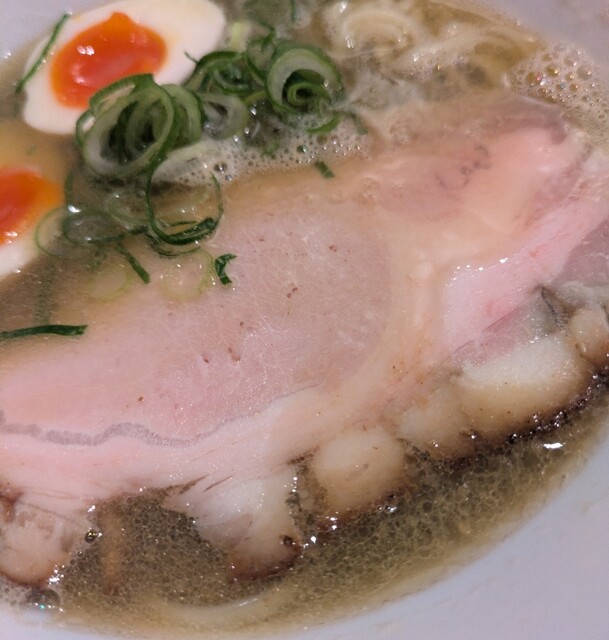 平日のランチタイムです。地下鉄四ツ橋駅直結のビル地下1階です。ちょい早め11時40分到着です。店内はこの時間でも先客数名、その後もどんどんお客さんです。 今回は?ここの売りの1品。特製貝塩らぁ麺です。 スープははまぐりに帆立を炊き上げた貝出汁スープ、牡蠣煮干しを合わせた塩タレを合わせて、貝の旨味しっかりの美味しいスープ。麺は平打ちの中太麺、もっちり食感の美味しい麺、貝出汁スープが良く絡んで美味しいです。 青ネギの食感良く。特製の味玉、黄身とろとろ味付もちょうど良く美味しいです。 特製で4枚入ったレアチャーシュー、脂身の無いチャーシューは肉々しく歯ごたえ良く美味しいです。脂身の多いチャーシューも脂身ジューシー、柔らかく美味しいですね。 貝の旨味しっかりの美味しい一杯でした。
