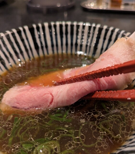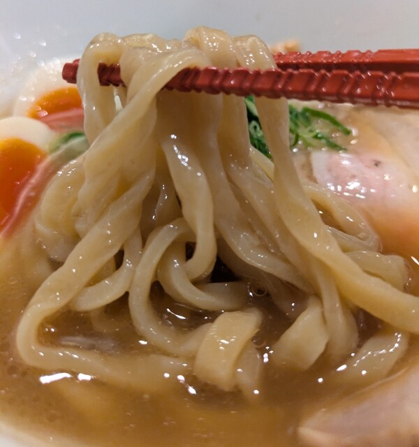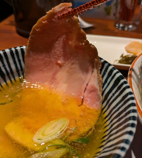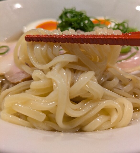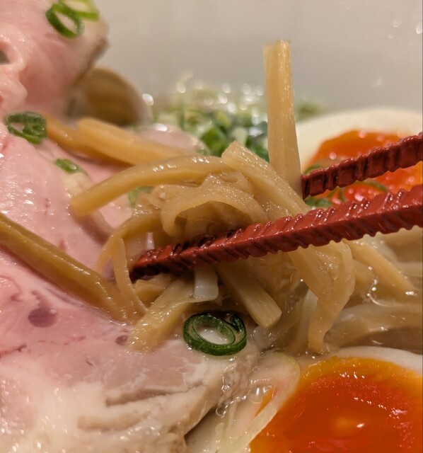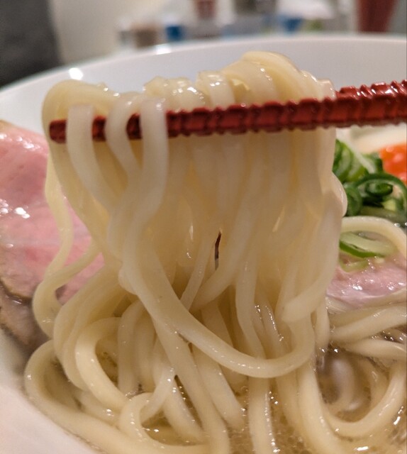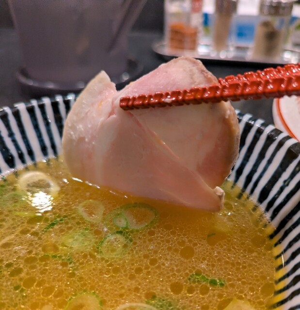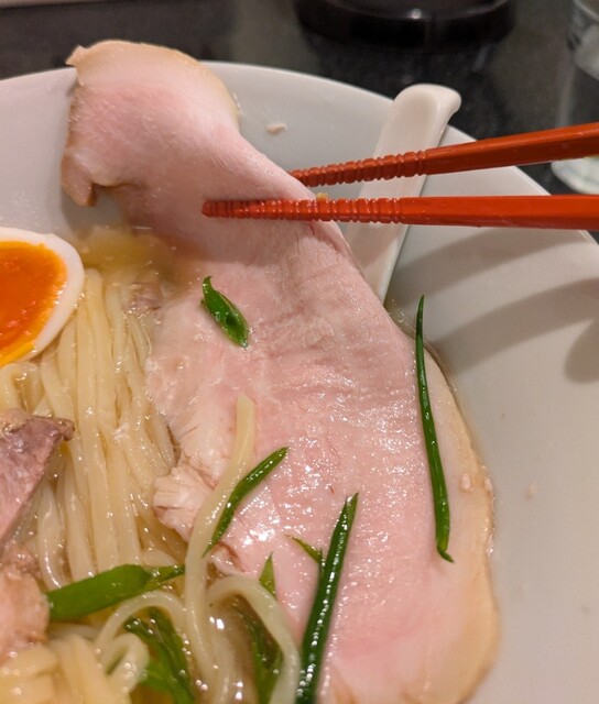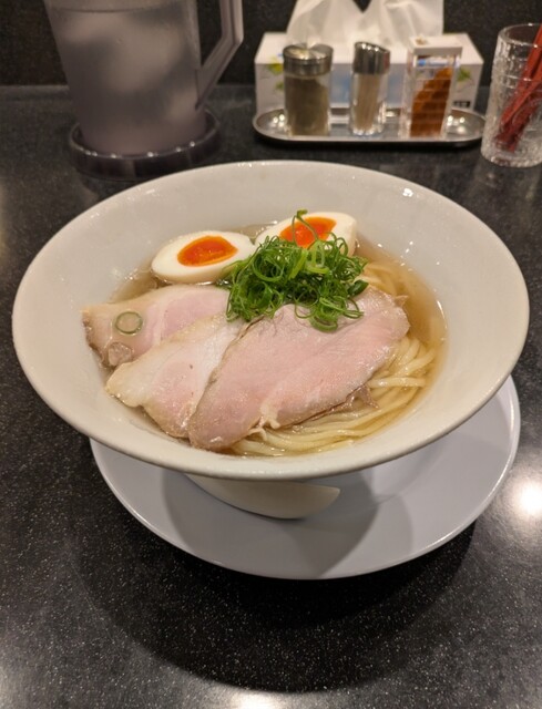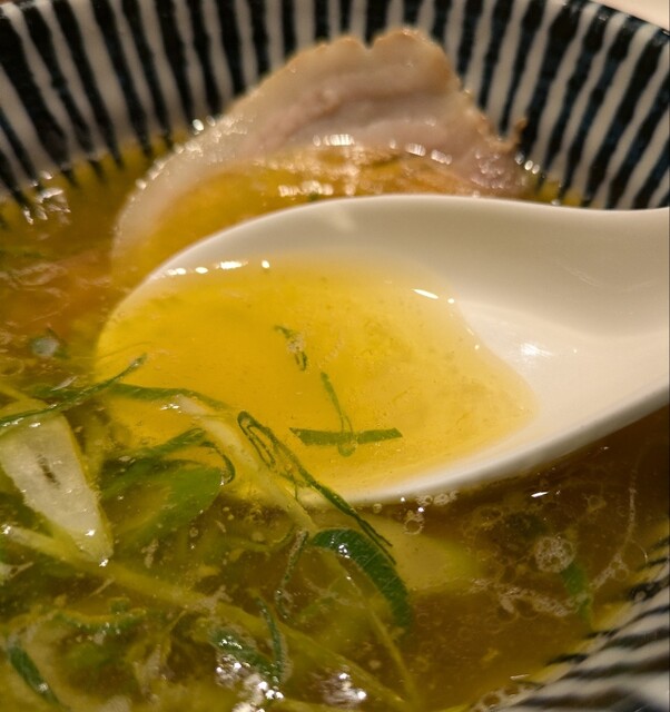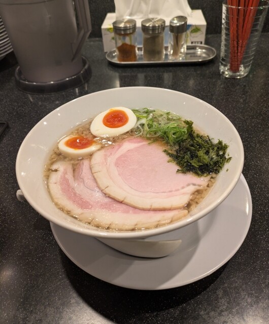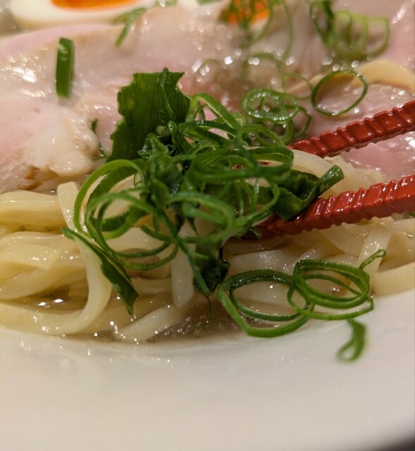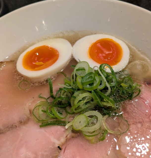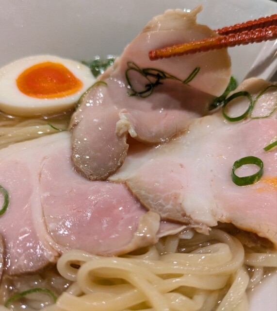 平日のランチタイムです。地下鉄四ツ橋駅直結のビル地下1階です。ちょい早め11時40分到着です。店内はこの時間でも先客数名、その後もどんどんお客さんです。 今回は?ここの売りの1品。特製貝塩らぁ麺です。 スープははまぐりに帆立を炊き上げた貝出汁スープ、牡蠣煮干しを合わせた塩タレを合わせて、貝の旨味しっかりの美味しいスープ。麺は平打ちの中太麺、もっちり食感の美味しい麺、貝出汁スープが良く絡んで美味しいです。 青ネギの食感良く。特製の味玉、黄身とろとろ味付もちょうど良く美味しいです。 特製で4枚入ったレアチャーシュー、脂身の無いチャーシューは肉々しく歯ごたえ良く美味しいです。脂身の多いチャーシューも脂身ジューシー、柔らかく美味しいですね。 貝の旨味しっかりの美味しい一杯でした。