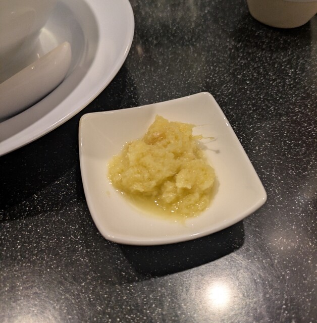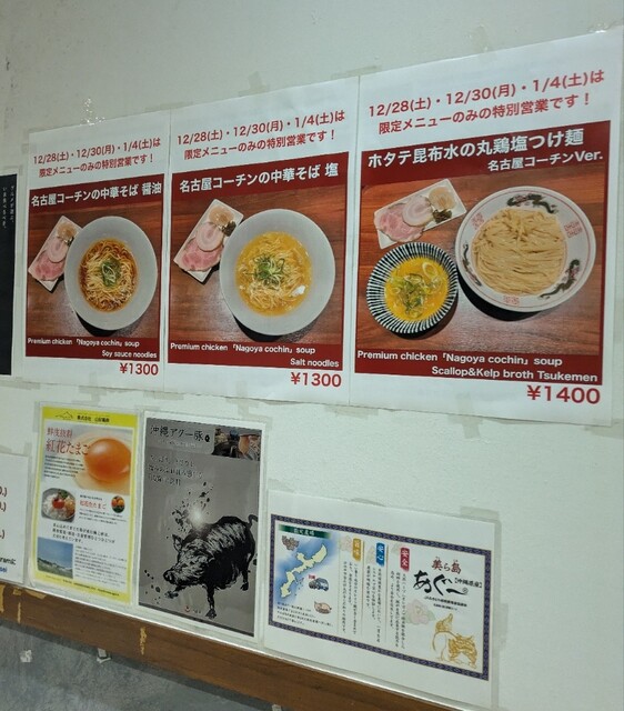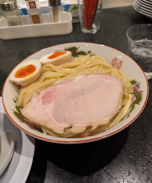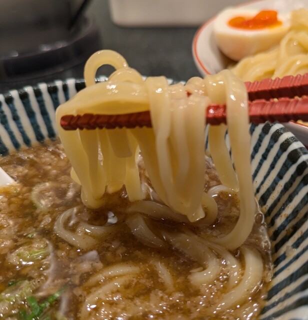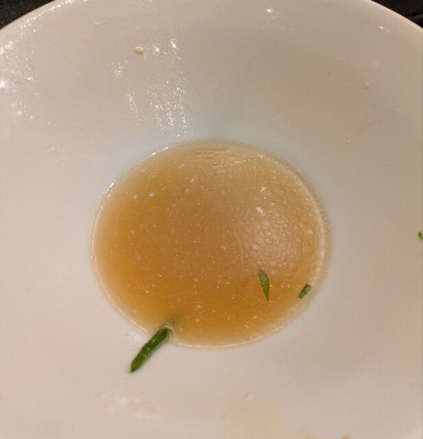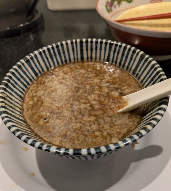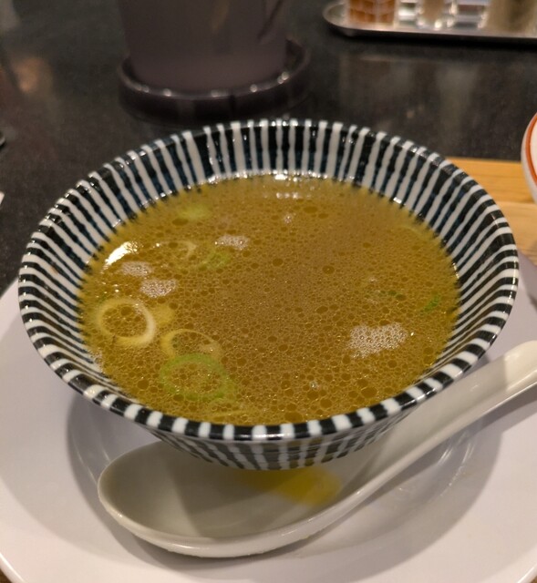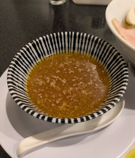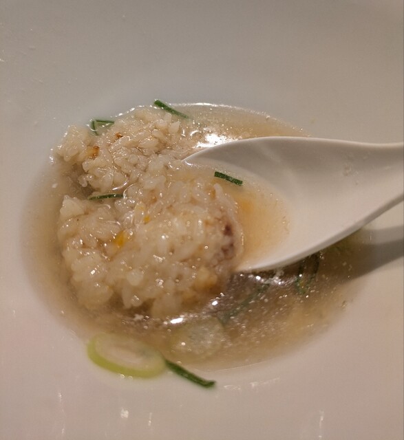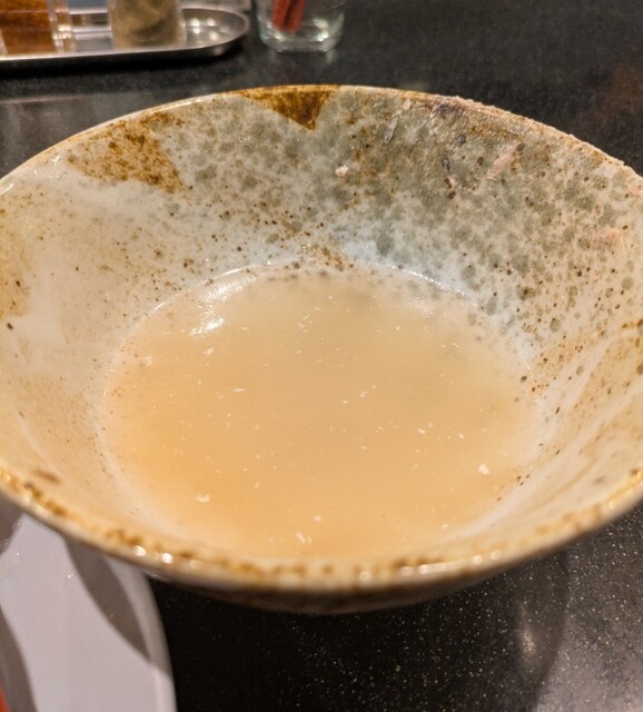 今年最後の週末、この日は限定メニュー3品だけでの営業です、時間も午前11時15分到着、店内はかなりの賑わいです。今回は?限定、ほたて昆布水の名古屋コーチンつけ麺です。味玉もトッピングです。スープは名古屋コーチンから取られた、濃厚な塩清湯スープ、表面には大量の鶏油です。麺は平打ち麺中太麺、ほたて昆布水に漬かって、そのまま頂いてもほたての旨味に昆布の旨味、塩身もほんのり美味しいですね。スープに潜らせて、ほたて昆布水の旨味に名古屋コーチンの旨味麺に良く絡んで美味しいです。青ネギの食感良く、別皿の具材、ほたてもプリプリ、炙ったほたては香ばしく美味しいです。刻んだ昆布スープに潜らせて麺と一緒にこれ又美味しい、味玉も程よい半熟です。肩ロースチャーシュー、肉々しく歯ごたえ良くこれ又美味しいです。バラチャーシューも柔らかく脂身ジューシー又々美味しいですね。最後はもちろんスープ割です。はまぐり出汁割られて、名古屋コーチンにほたて昆布、はまぐりの旨味まで重なりさらに美味しいスープに。年末限定の贅沢な美味しい一杯でした。