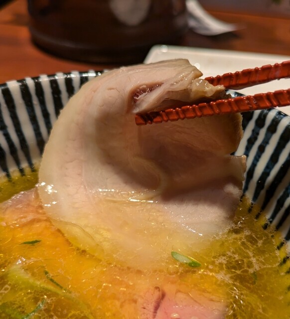 週明けミナミでお昼ご飯です。四つ橋線、四ツ橋駅直結のビル地下1階ですね。時間も12時ちょうどくらい、店内はかなりの賑わいです。券売機で食券買って。店主さんとご挨拶。今回は?特製芳醇地鶏中華そば塩です。限定のニボフレッソか冷しとも迷あしたが、朝からこれが頂きたかったので。スープは地鶏から取られた、塩清湯スープ、鶏油が浮いて、地鶏の旨味しっかり、塩身も程よく鶏油のこくも感じる、美味しいスープ。平打ちの中細麺、地鶏塩清湯スープが良く絡んで美味しいです。青ネギの食感も良く、特製の味玉、黄身も程よく、味付もちょうど良く美味しいです。特製の4枚入ったレアチャーシュー、ジューシーで歯ごたえ良く肉々しくこれ又美味しいです。地鶏の旨味がしっかり感じられる美味しい一杯でした。