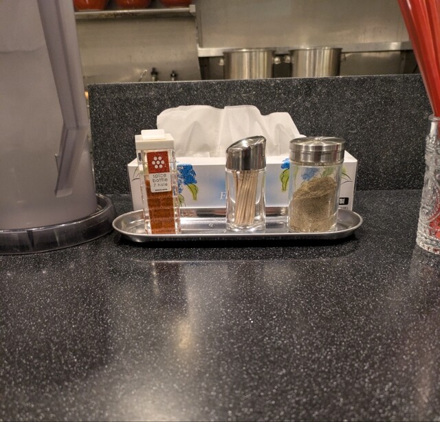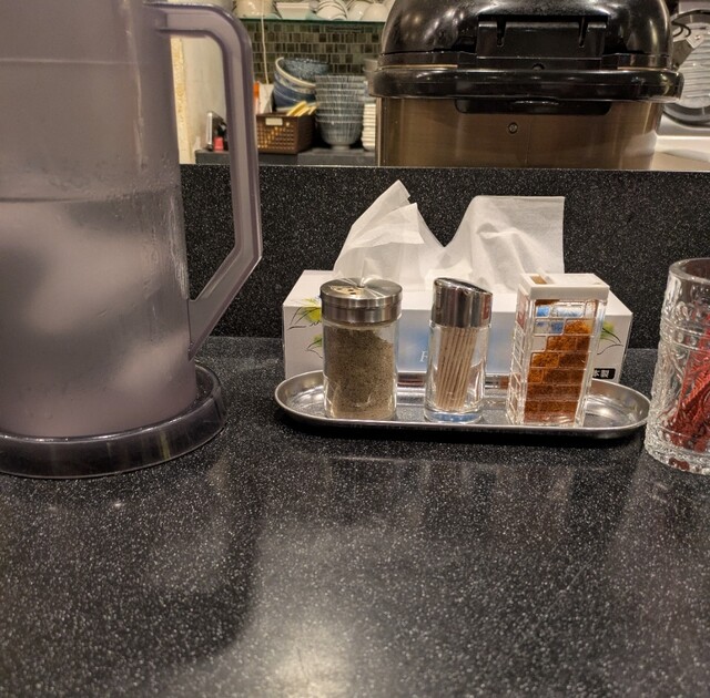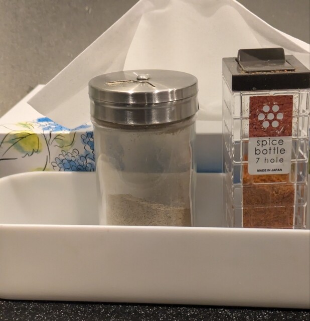 別皿の黄金生姜投入して、生姜の風味が良いですね、体がポカポカしますね。お勧めの卓上の胡椒降って、ちょいピリッとこれ又美味しいです。だしおにぎりはだしで炊いたごはんのおにぎり、キュウリの漬物もついて、だしがきいて美味しいおにぎりですね。