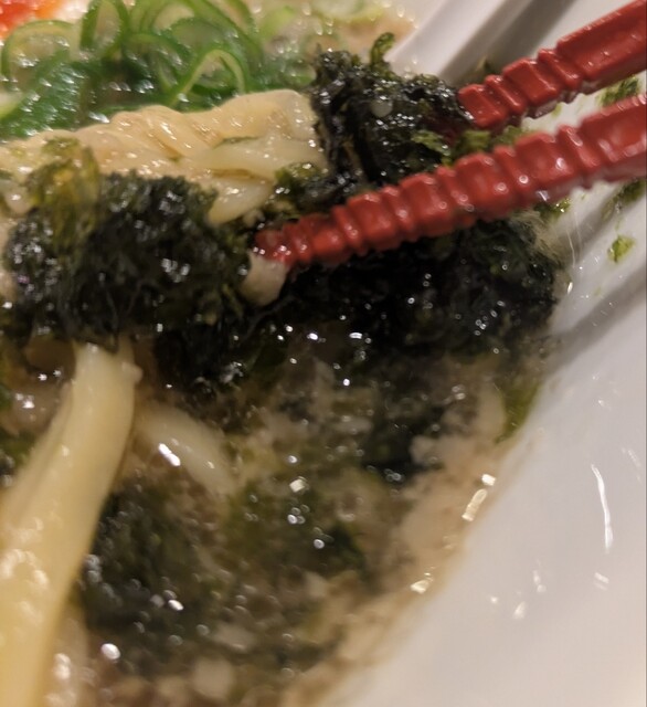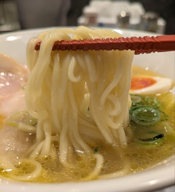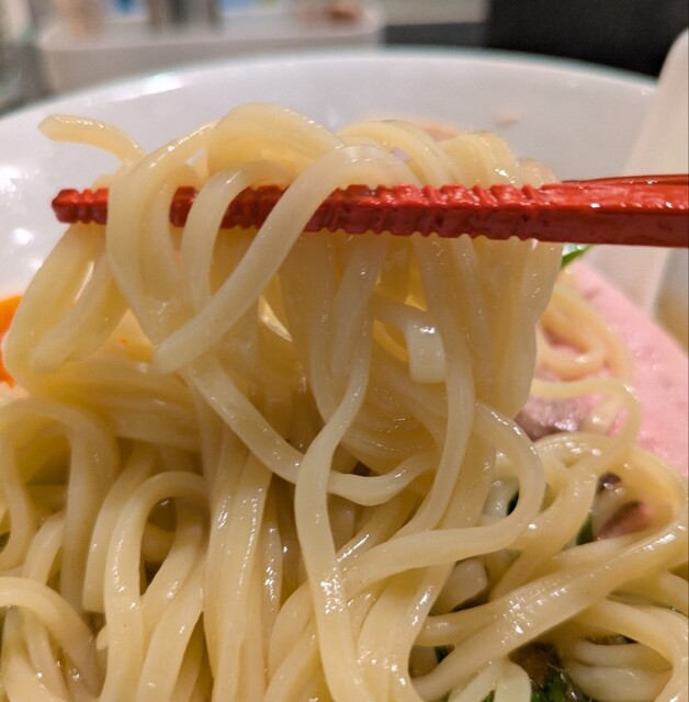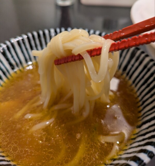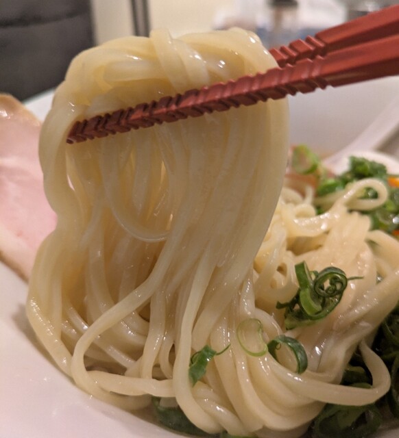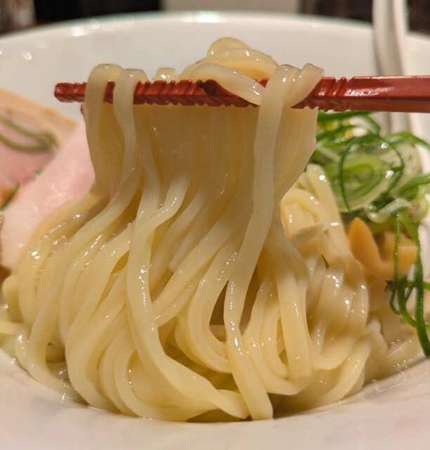 麺は中細麺、オマール海老の塩スープが良く絡みますね。麺をすするとオマール海老の風味が鼻に抜けてこれ又美味しいです。