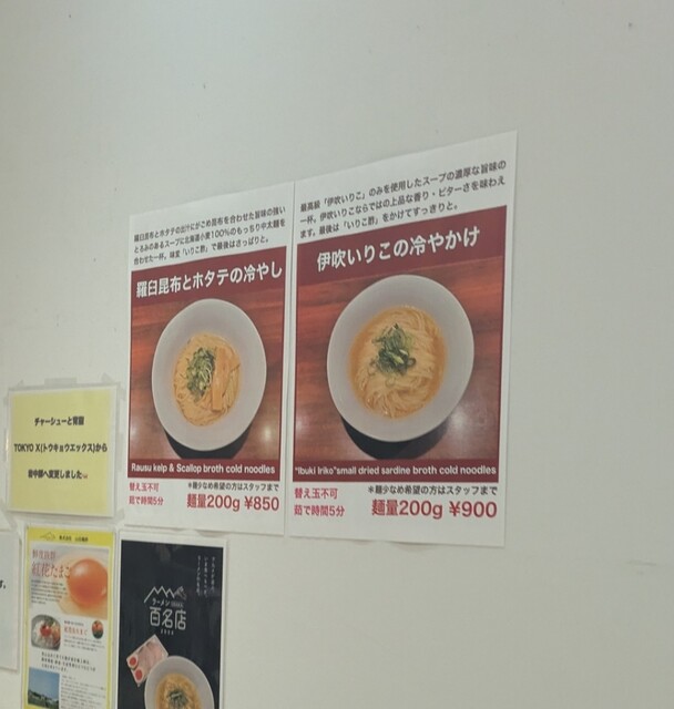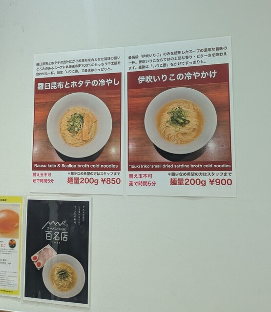 お昼はもう夏並の暑さです、そんな暑い中の訪問です。夕方5時半オープン直後です。すでに店内は先客数名です。券売機で食券買って。今回は?暑いので、特製伊吹イリコの冷やかけです。スープは伊吹イリコから取られた冷たいスープ、イリコ風味の程よい冷たい美味しいスープ。麺は平打ち中太麺、デフォ200gですが?僕は150gで頂いて。水でしっかり〆られて、冷たいイリコスープが良く絡んで美味しいです。青ネギの食感も良く。途中で頂いたイリコ酢入れて、酸味でさらにさっぱり。特製の味玉も黄身とろとろ、程よい味付美味しいです。特製の3枚入ったレアチャーシューも柔らかく肉々しくこれ又美味しいです。一緒にだしおにぎりです。だしのきいた美味しいおにぎり、キュウリの漬物良い箸休め、伊吹イリコの冷やかけの麺を食べ終えると、だしおにぎり、投入、だしおにぎり茶漬けです。冷たいイリコスープにだしがしゅんで、ごはん進む美味しい〆ごはんです。暑い日にぴったりな美味しい冷たい一杯でした。