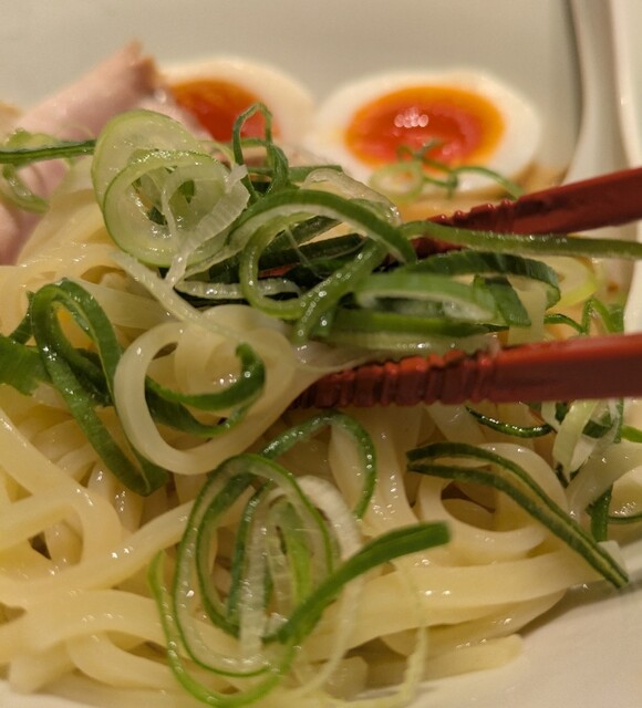平日のランチタイムです。四ツ橋駅直結のビル地下1階ですね。店頭は数名の待ちが出来てる様子です。先に券売機で食券買って、後ろに並んで待つ事に、回転も早く5分程で店内に。今回は?本日の限定。カマス煮干しの冷やしです。味玉もトッピングです。スープはやや白濁したカマス煮干しから炊きだされた冷たいスープ、結構カマス煮干しがガツンと来る、冷たい美味しいスープです。カマスのクセもほんのりこれ又美味しいスープですね。麺は水でしっかり〆られた平打ち中太麺。喉越し良く腰も強く、濃厚冷たいカマス煮干しスープ良く絡んで美味しいです。青ネギの食感も良く、トッピングした味玉、黄身も程よく味付もちょうど良く美味しいです。レアチャーシューは肉々しく歯ごたえ良くこれ又美味しいです。ガッツリカマス煮干しのきいた冷たい美味しい一杯でした。