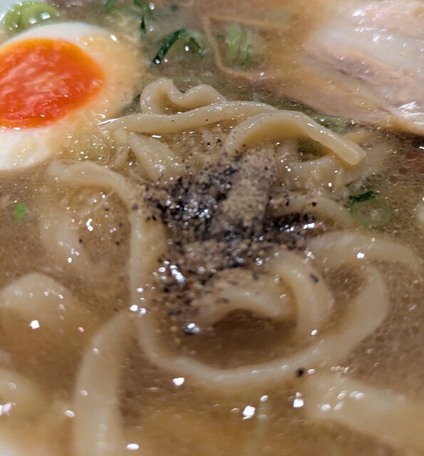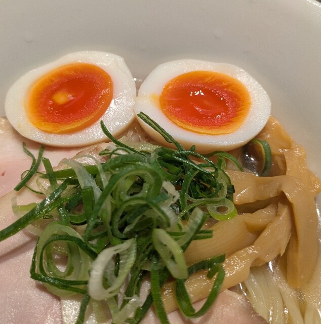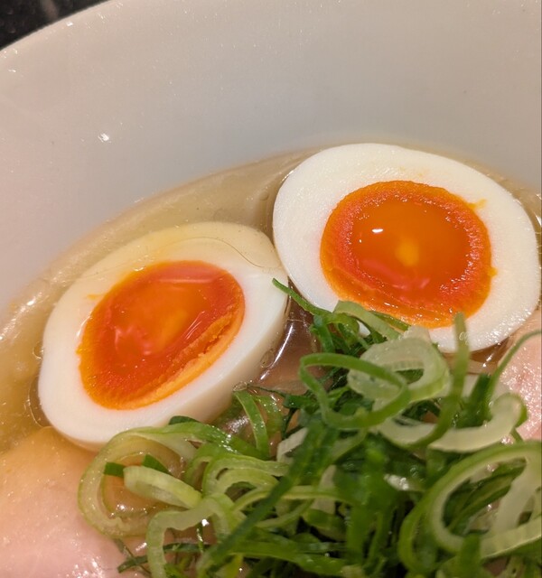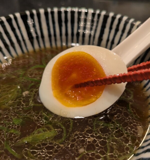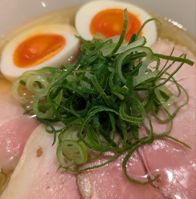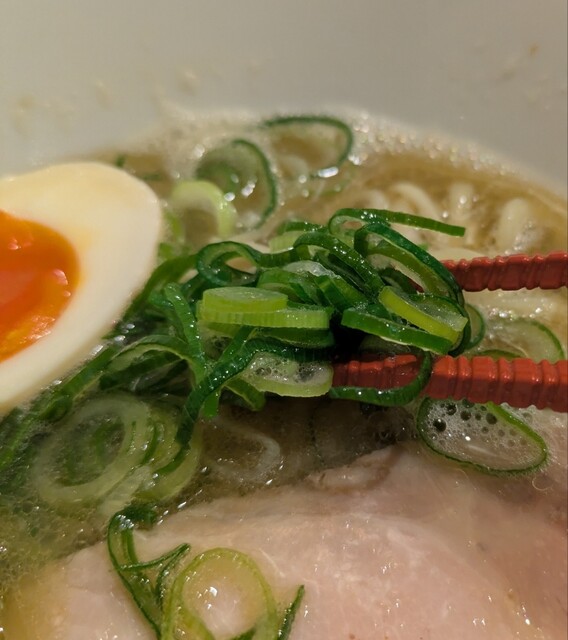 青ネギの食感良く。トッピングした味玉も黄身とろとろ味付もちょうど良く美味しいです。