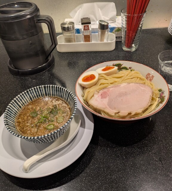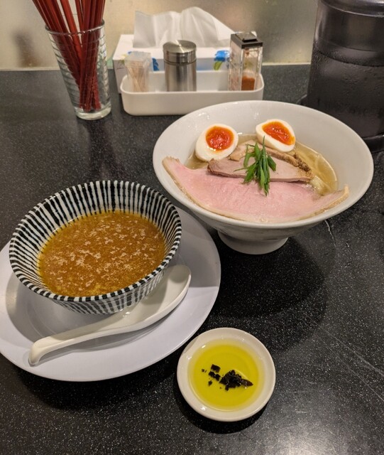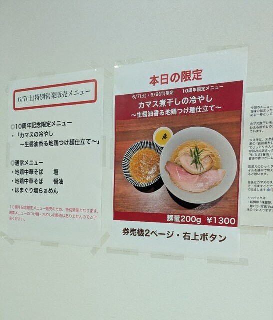 週末の大阪ミナミ、四ツ橋ですね、2日連続での訪問です。10周年おめでとうございます。なので、11時40分大行列です。先に券売機で食券買って、最後尾に並びます。その後もどんどん行列が伸びていき、僕の後ろは3倍以上の行列に。40分並んで店内に。今回は?10周年記念限定。カマス煮干し冷やし、生醤油香る地鶏つけ麺仕立てです。冷やしラーメンとつけ麺が一緒になったような一杯です。先ずはカマス煮干し冷やしから頂いて、スープはカマスの旨味しっかり冷たくあっさり美味しいスープ。平打ち中太麺、水でしっかり〆られて、冷たいカマススープが良く絡んで美味しいです。青ネギの食感も良いですね。つけ麺のスープは名古屋コーチンに長州黒かしわから取られた清湯スープ、生醤油を合わせて、表面には多めの鶏油、熱々で地鶏の旨味しっかり、生醤油も程よい美味しいスープ、カマス煮干し冷やしの麺を潜らせて頂いて、地鶏、生醤油スープが良く絡んで美味しいです。トッピングした味玉、黄身とろとろ味付もちょうど良く美味しいです。巻チャーシュー、脂身も程よく肉々しく歯ごたえ良く美味しいです。レアチャーシューも程よい味付これ又美味しいです。添えてあるボルチーニオイル投入、ボルチーニの風味が加わりさらに美味しい味変です。麺を食べ終えると、生醤油地鶏スープにカマス煮干し冷やしスープ投入スープ割です。地鶏に生醤油の旨味にカマスの旨味、ボルチーニの風味も加わり、かなり美味しいスープ割です。10周年記念の冷やしからつけ麺、スープ割までつながる美味しい一杯でした。