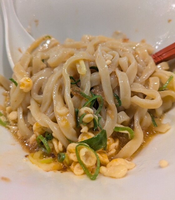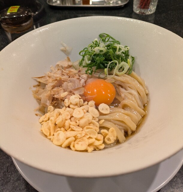 平日のお昼ご飯です。心斎橋からちょいと。歩いて、西区新町四ツ橋ですね。駅直結のビル地下1階です。時間も12時20分到着です。この時間、かなりの賑わいですね。食券買って席に。店主さんとご挨拶してからの。今回は?限定。冷やしTKMMです。卵かけ麺です。麺はもち小麦100%のもち姫で打たれた平打ちに太麺。デフォは200gですが、150gにして頂いて頂いて。だし醤油タレに青ネギ、鰹節、エビ入りの天かす。中央には山形県産紅花たまにが落とされて。先ずは良く混ぜて頂きます。水でしっかり〆られたもち姫の太麺、もちもち食感、腰も強く美味しいです。卵に醤油タレも良く絡みますね。青ネギの食感良く鰹節の風味良く。天かすん9食感が良いアクセント、これ又美味しいです。一緒にだしおにぎりも頂いて、TKMをおかずに、キュウリの漬物が程よい箸休めですね。麺を食べ終えると。だしおにぎり投入、〆のだしおにぎりTKGです。良く混ぜて、だしのきいたおにぎり、醤油タレ、卵良く絡み美味しいです。鰹節の風味も良く、青ネギや天かすの食感も良く又々美味しいです。夏にぴったり冷たい美味しい一杯でした。