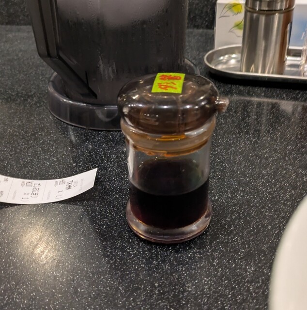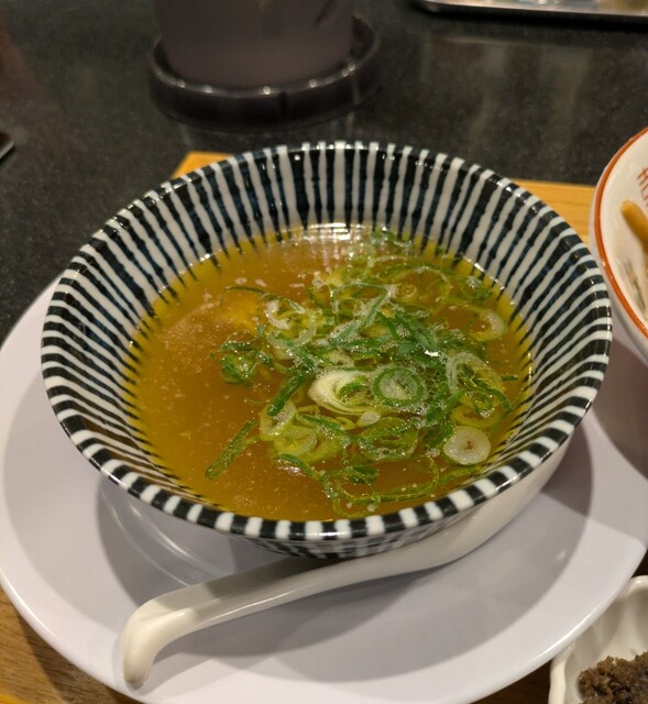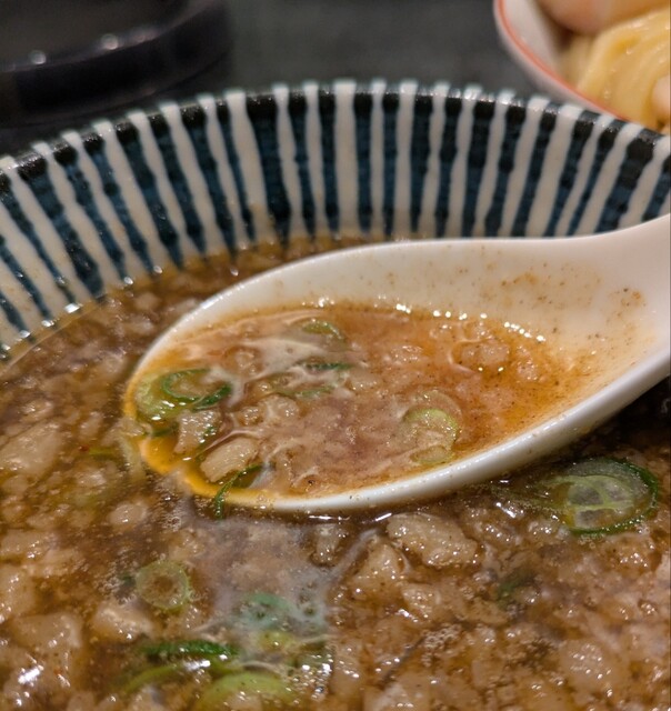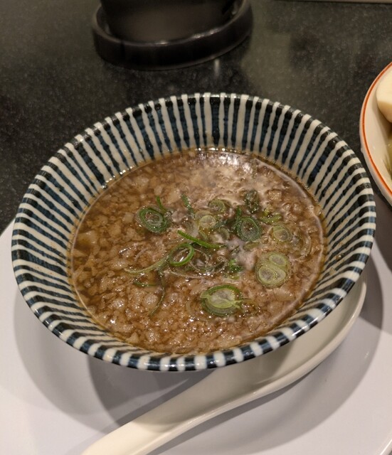 用事を済ませた時間も夕方6時です。四ツ橋駅直結のビル地下一階ですね。先客数名、券売機で食券を買って、店主さんとご挨拶して席に、ちょいと久々でしたが?今回は?特製水出し昆布の淡麗つけ麺です。水出し昆布に漬かった自家製の平打ち中細麺、そのまま頂いても昆布の旨味で美味しいですね。スープは以前と変わったようですね?節系の魚介香る淡麗醤油スープ、熱々で、青ネギの食感も良く美味しいスープ、昆布水に漬かった麺をくぐらせて?節系の旨味に昆布の旨味、麺に良く絡んで美味しいですね。肉団子風味も良く美味しいです。特製の味玉黄身とろとろ味つけもちょうど良く美味しいです。レアチャーシューも肉肉しく軟らかくこれ又美味しいです。最後はもちろんスープ割、昆布水を投入して?程よい濃さに、美味しい〆スープですね。リニューアルしたスープに昆布水の旨味の美味しい一杯でした。