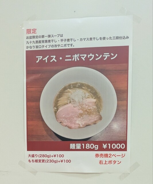 少し涼しくなった夕方5時半です。お盆休みミナミの街は人が多いですが?四ツ橋駅直結のビル地下1階ですね。オープン直後の訪問です。もちろんポールです。店主さんとご挨拶して、その後はどんどんお客さんです。今回は?限定。アイス・ニボマウンテンです。味玉もトッピングです。前回も限定でやってましたが、予定が合わず頂けませんでしたが、今回はちゃんと頂けました。スープはややセメント系の煮干しスープ、冷たく冷やされて、煮干しの旨味がしっかりでもくどく無い、冷たい美味しいスープです。平打ちの中太麺、水でしっかり〆られて、喉越しの良い美味しい麺、冷たい煮干しスープが良く絡んで美味しいです。刻んだ玉葱、煮干しスープとの相性抜群、甘味に食感も良くこれ又美味しいです。トッピングした味玉も黄身も程よく味付もちょうどよくこれ又美味しいです。岩中豚のレアチャーシュー、肉々しく歯ごたえ良く又々美味しいです。濃厚ですがくどく無い冷たい煮干しガッツリの美味しい一杯でした。