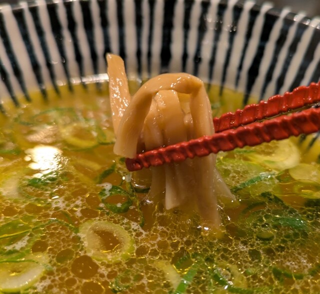 今回は?限定。NEOノス中華そばです。味玉に黄金生姜もトッピング、だしおにぎりも頂いて。スープは昔懐かしさち新しさの鶏ガラ豚骨の生姜清湯スープ、あっさりですが旨味のある美味しいスープ。麺はもち姫麺、少し縮れた中太麺、もちもち食感の風味の良い美味しい麺、NEOノス系スープが良く絡んで美味しいです。青ネギの食感良く、細切りメンマもコリコリ美味しいです。