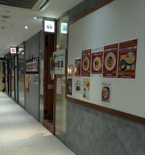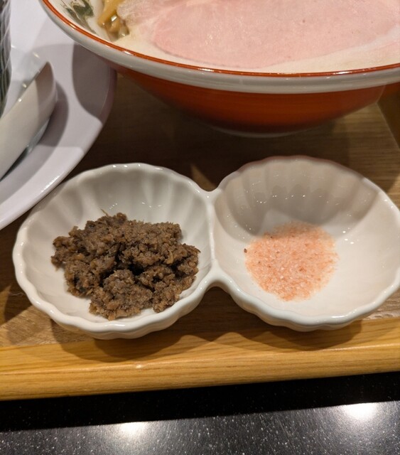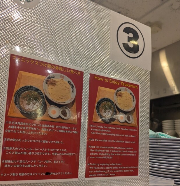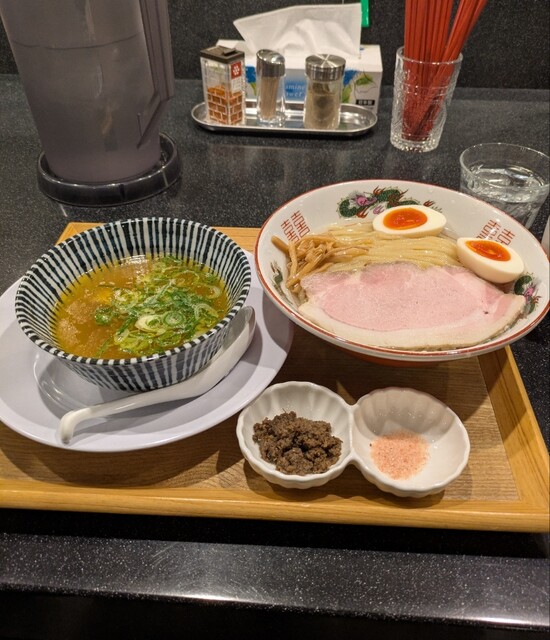 寒さ増してきた12月初旬ですが?この日もランチタイムです。四ツ橋駅近辺は心斎橋に比べると人が少なく感じますが?そんな四ツ橋駅直結のビル地下1階ですね。店頭に行列無しラッキーです。店内はかなりの賑わいですね。その後もどんどんお客さんです。今回は?またもや限定。フェニックス塩つけ麺です。チャー1Pトッピングに、味玉もトッピングです。スープは貝出汁の塩清湯スープ、熱々で冷めにくく、麺は平打ちの中太麺、昆布水に浸かって、細切りメンマにトッピングした味玉にレアチャーシューです。先ずはスープから頂いて、熱々ですが、貝の旨味しっかり、塩身もキリッと美味しいスープ、麺は昆布水から先ずはそのまま頂いて、喉越し良い美味しい麺、昆布の旨味が加わりさらに美味しいです。次はピンク岩塩、麺につけて、岩塩に塩身で昆布の旨味がさらに引き立ち美味しいですね。貝出汁スープに麺潜らせて、貝の旨味に昆布の旨味麺に良く絡んで美味しいです。青ネギの食感良く、粒ホタテもプリプリ美味しいです。細切りメンマもコリコリ柔らかく美味しいですね。トッピングした味玉、黄身とろとろ味付もちょうど良く美味しいです。途中で、添えられて、マッシュルームペースト投入です。マッシュルームの風味に貝出汁の旨味これが良く合うさらに美味しいです。麺に絡めてこれ又美味しいです。レアチャーシューも肉々しく歯ごたえ良くでも柔らかく又々美味しいです。最後はスープ割です。サバ節スープで割られて、貝出汁にマッシュルーム、サバ節の旨味まで加わるさらに美味しいスープですね。色んな味わい楽しめる美味しい一杯でした。