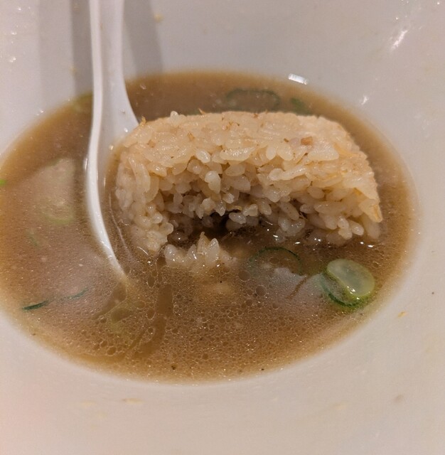 麺を食べ終えると?残ったスープにだしおにぎり投入〆ごはんです。NEOノス系スープにだしおにぎり、良く混ぜてこれ又美味しいです。