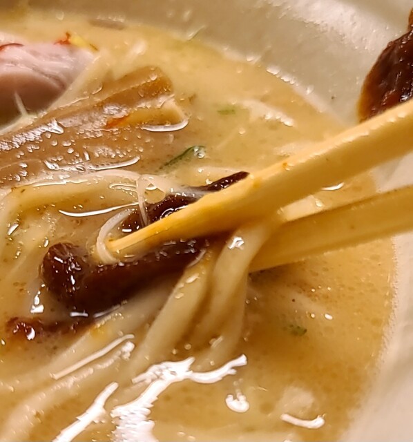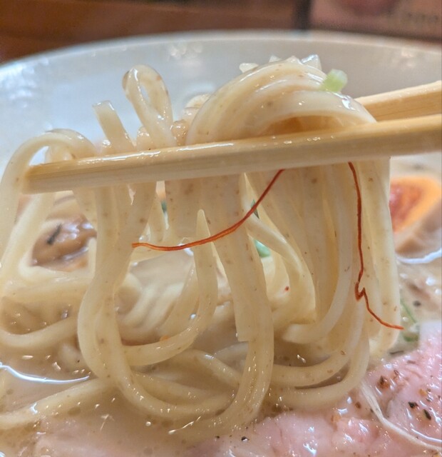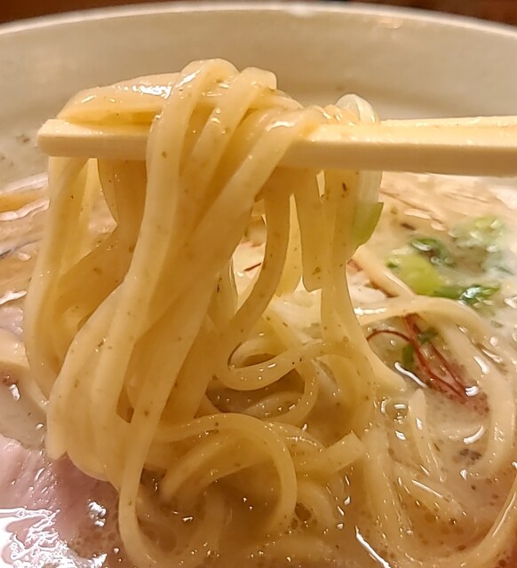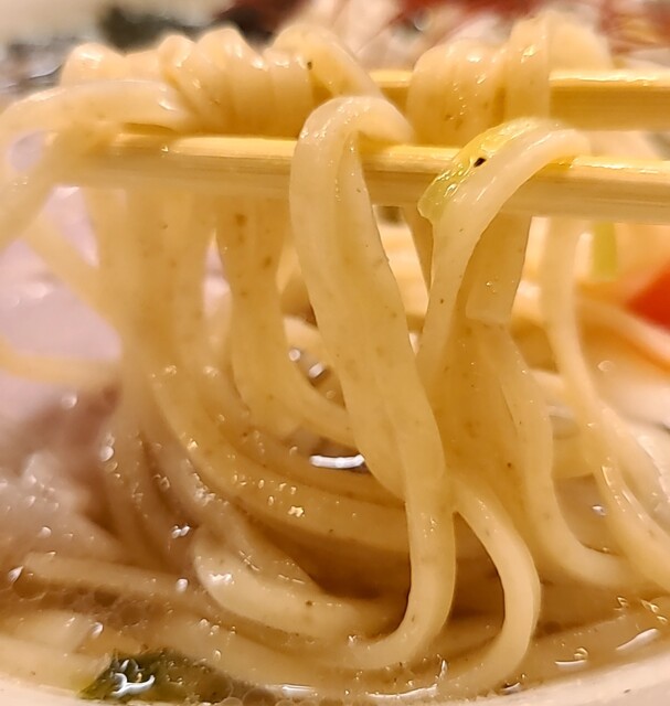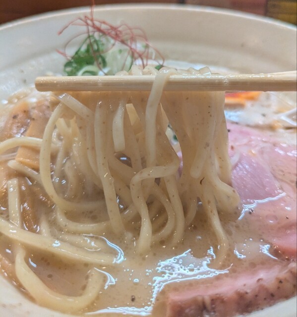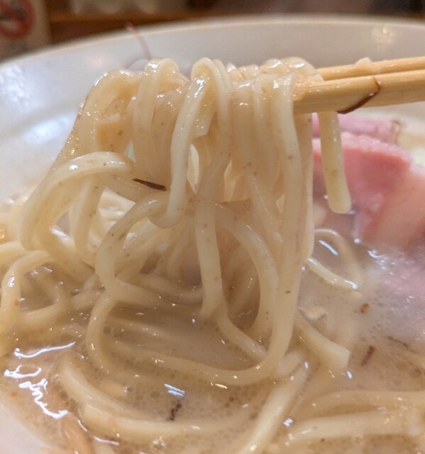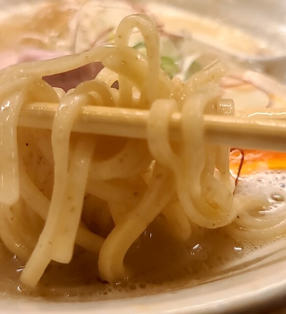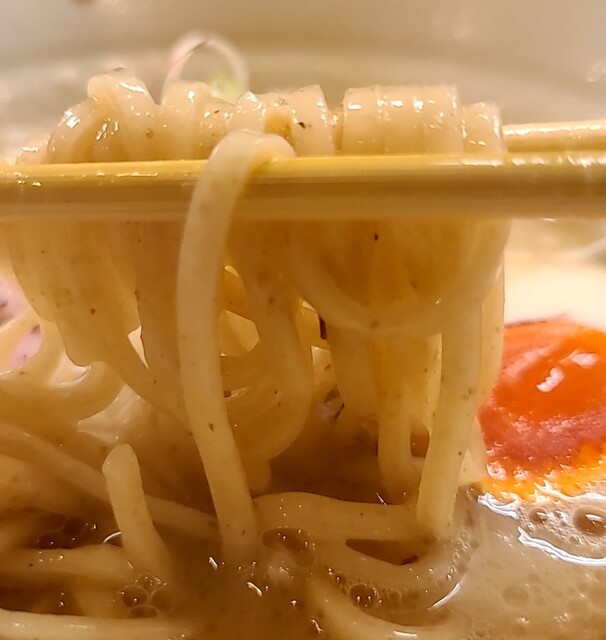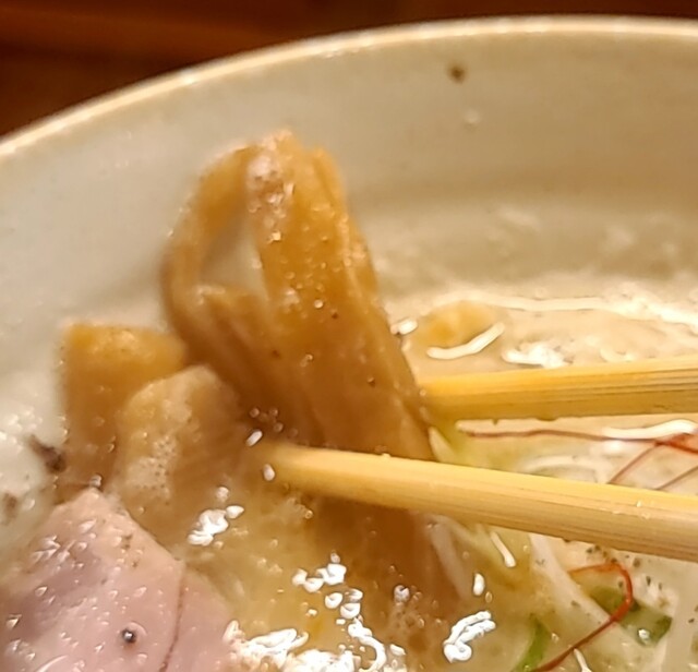 鶏白湯スープに朝鮮人参配合、優しい塩たれを合わせた、まったり美味しいスープ、自家製の平打ち中細麺、鶏白湯塩スープが良く絡んで美味しいです。