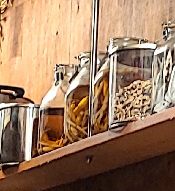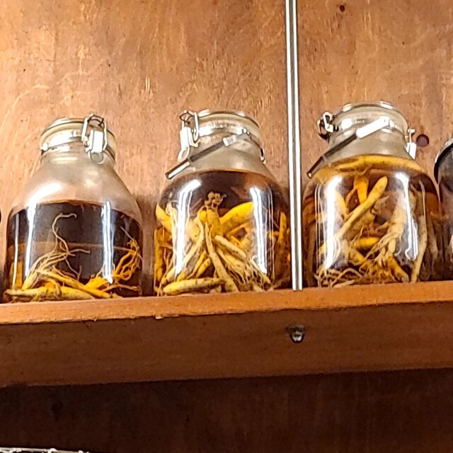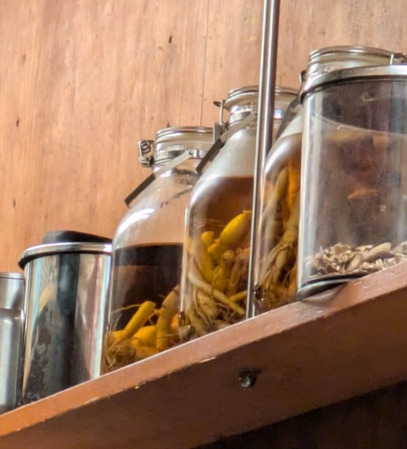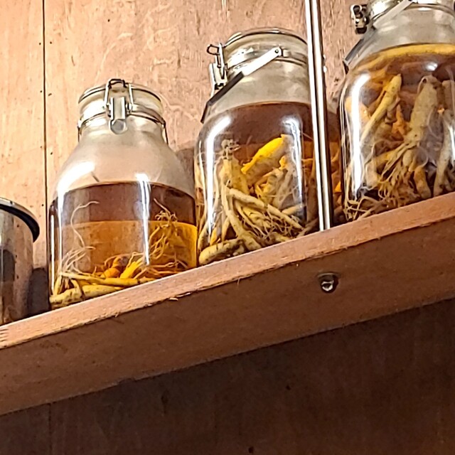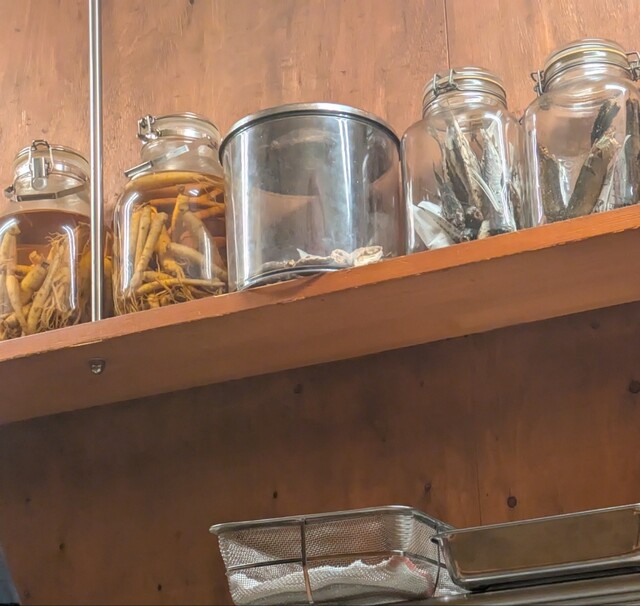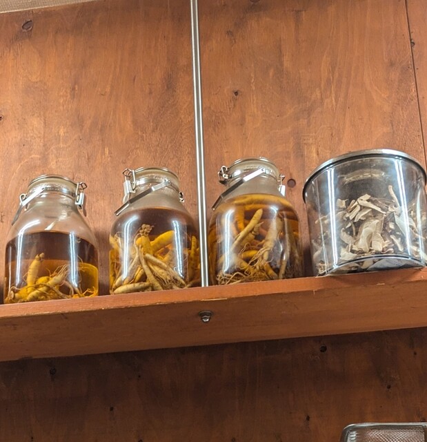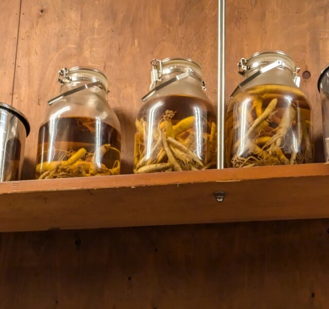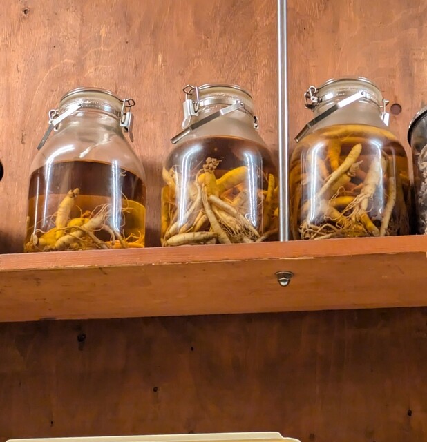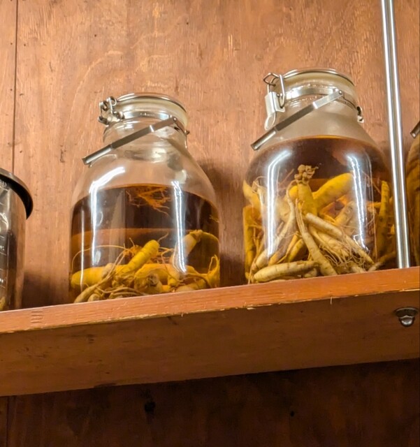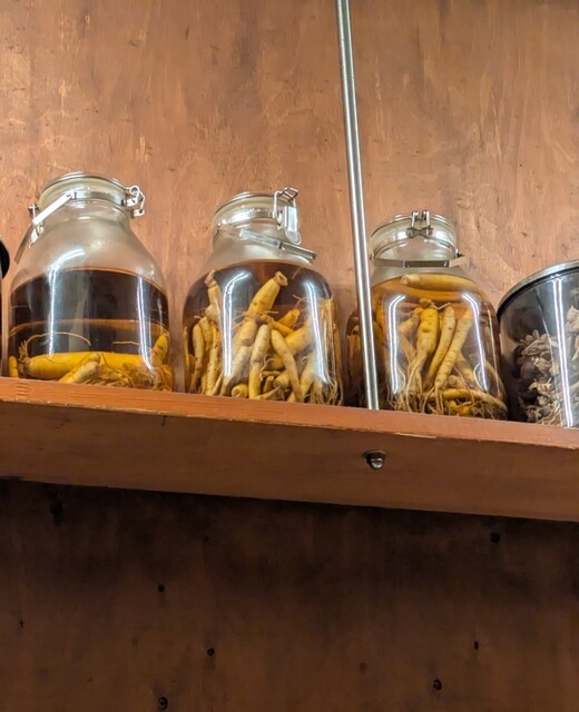 そんな飲み屋さんが連なる中にありますね。時間も日も落ちた5時50分です。店内に、先客数名です。棚には朝鮮人参も置いてありますね。今回のメニューは?