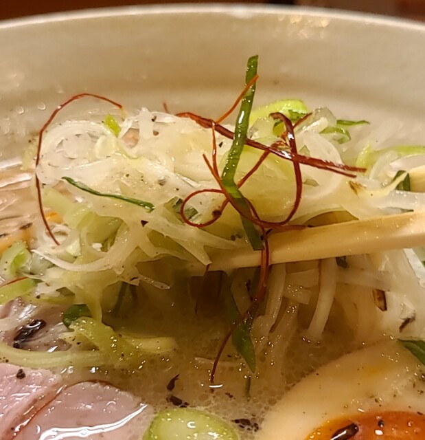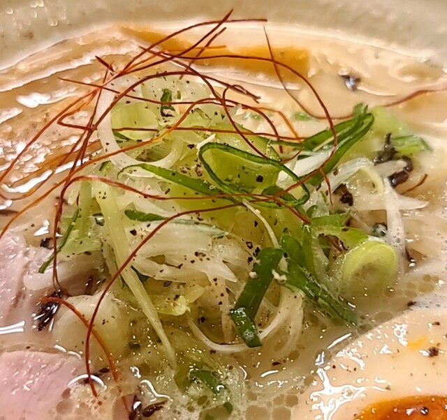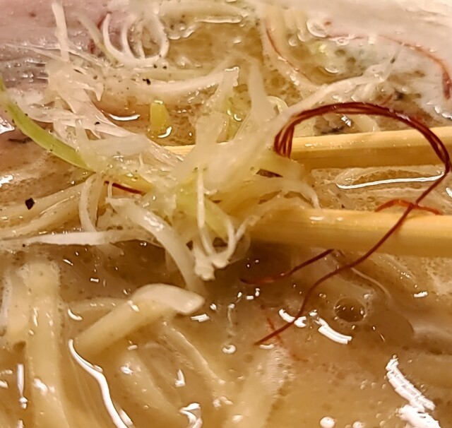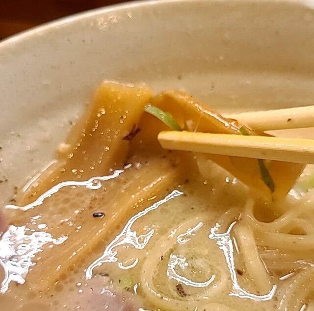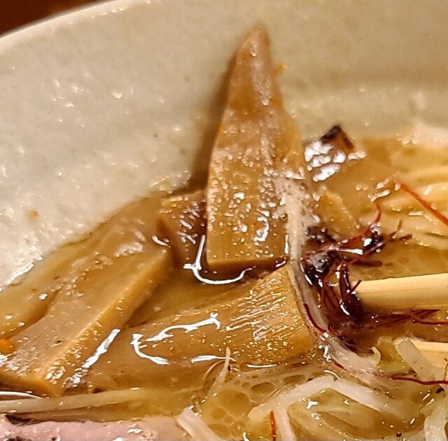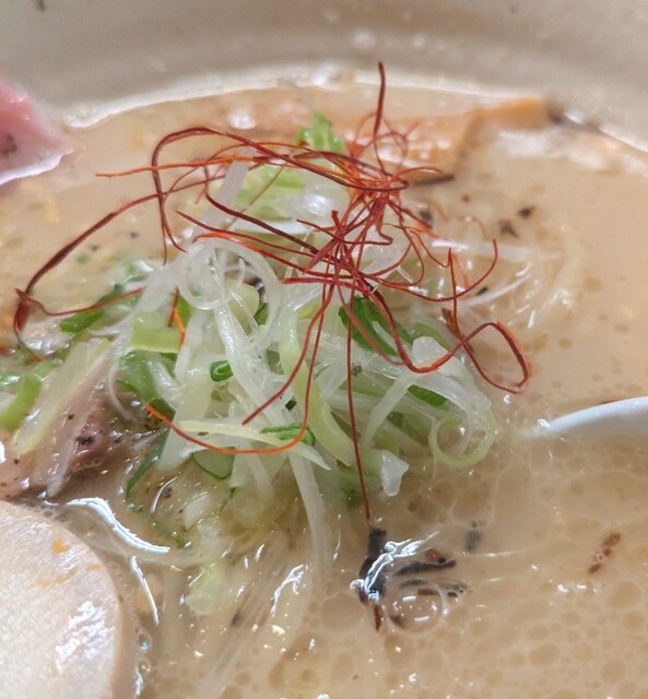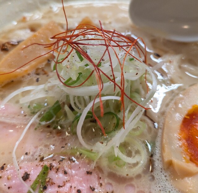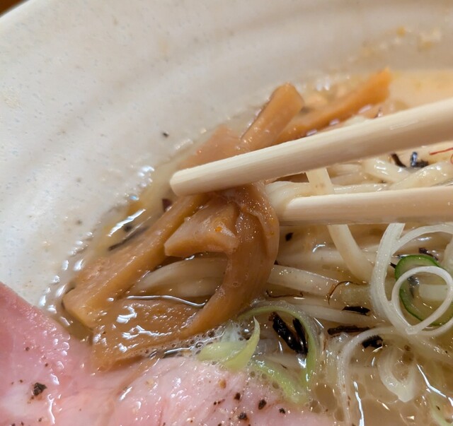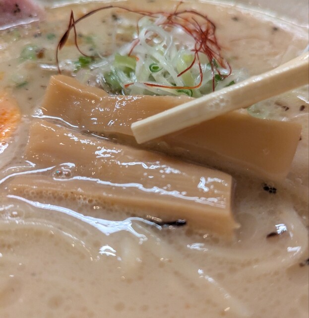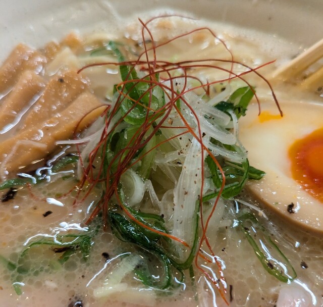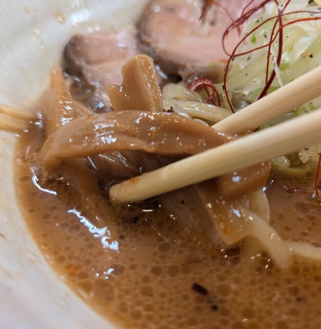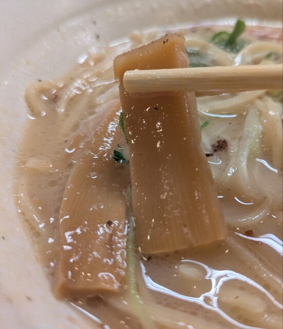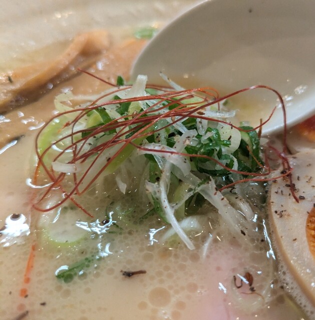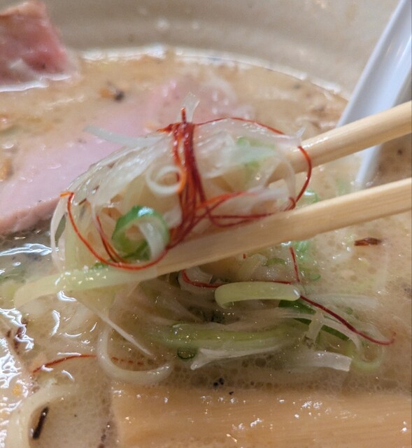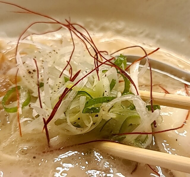 白ネギに青ネギ、良い食感です。糸唐辛子もピリッときいて美味しいですね。メンマもコリコリです。