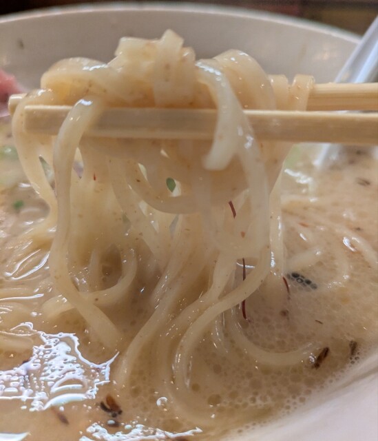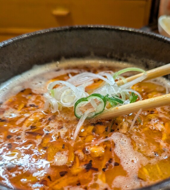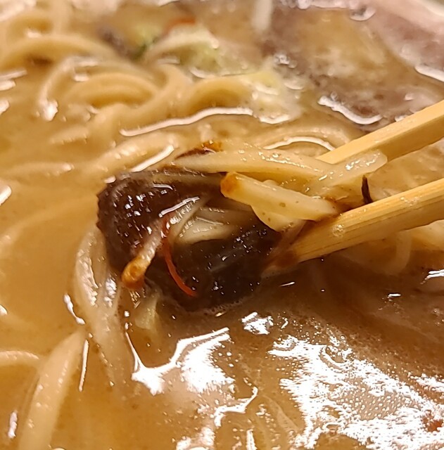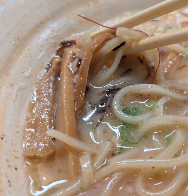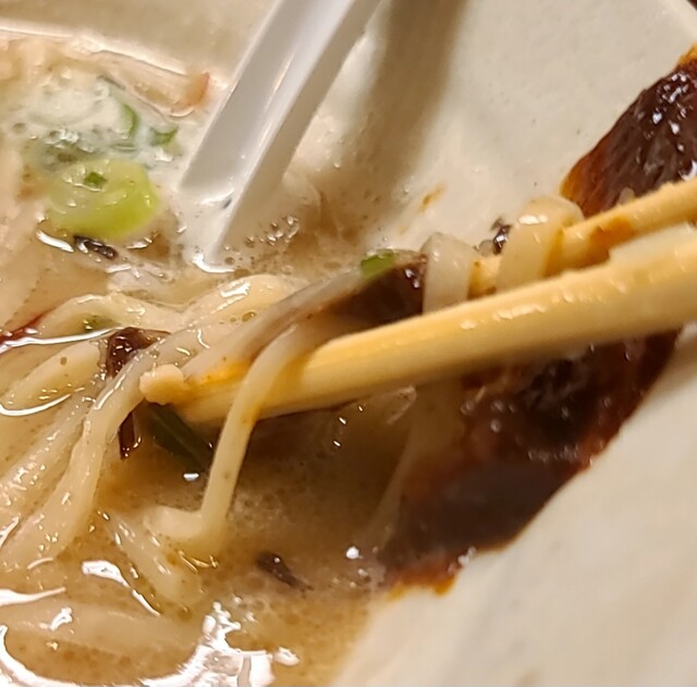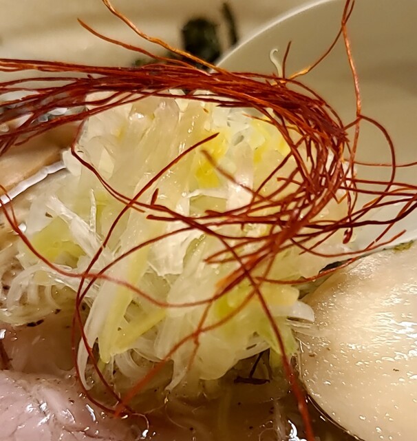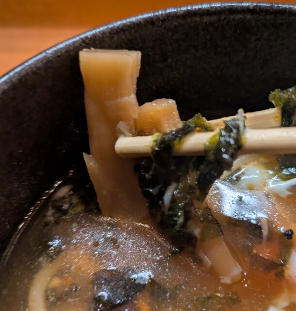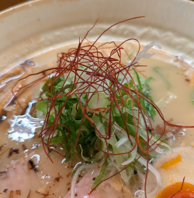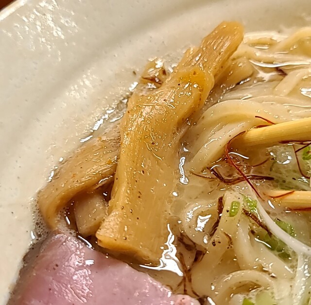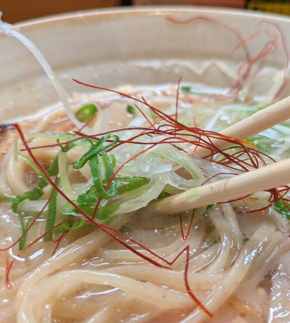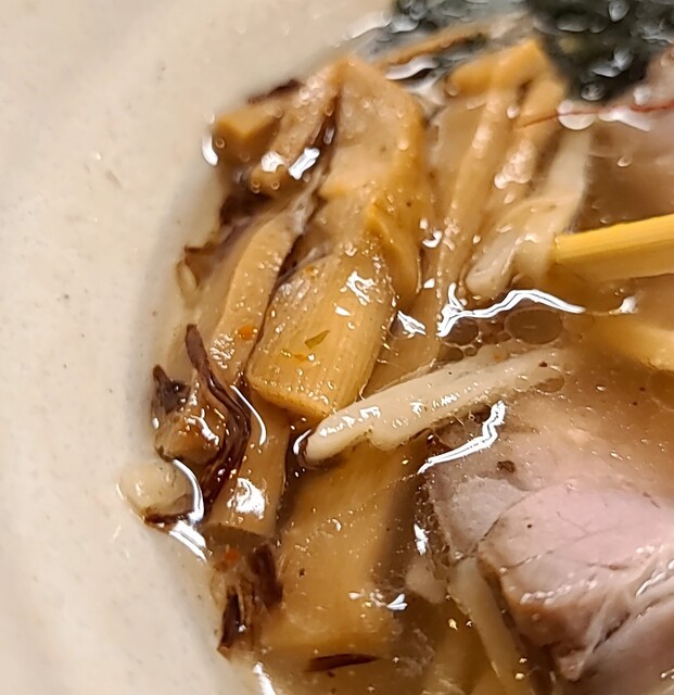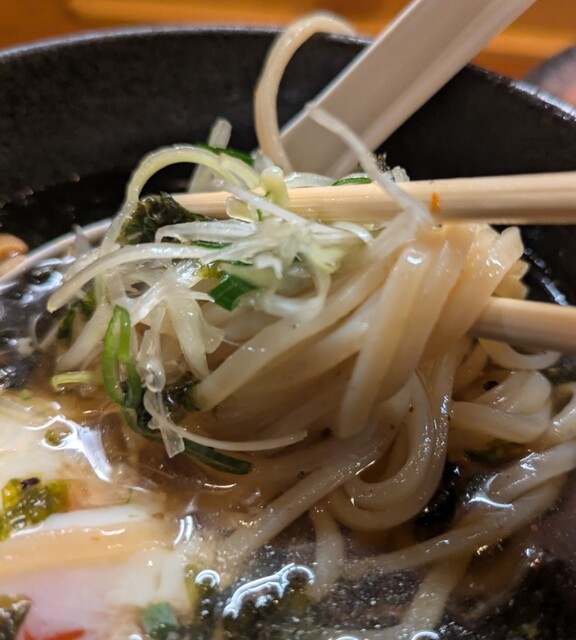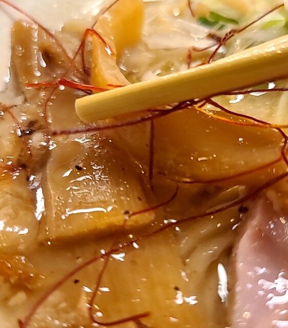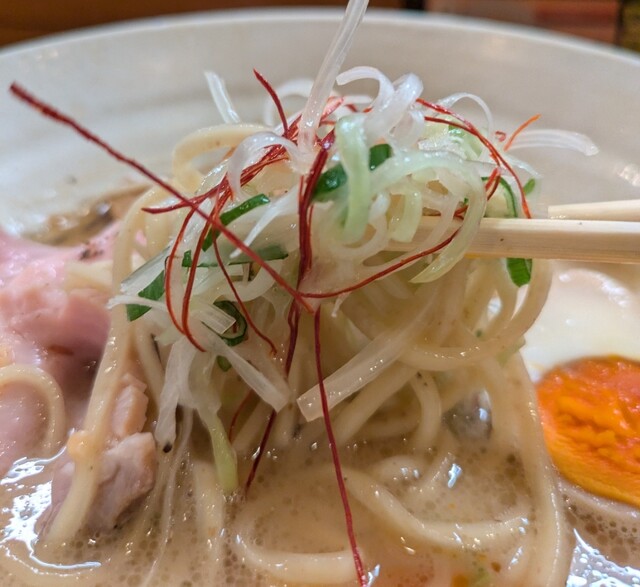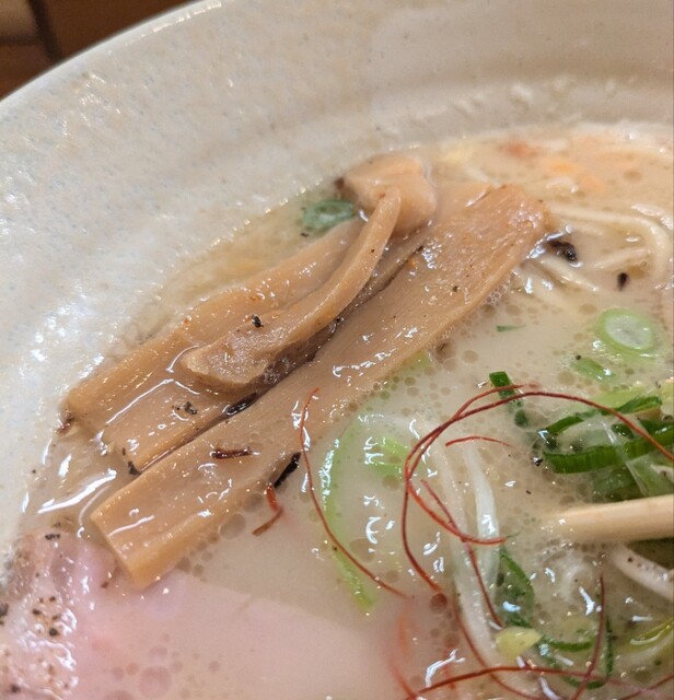 白ネギに青ネギ、良い食感です。糸唐辛子もピリッときいて美味しいですね。メンマもコリコリです。