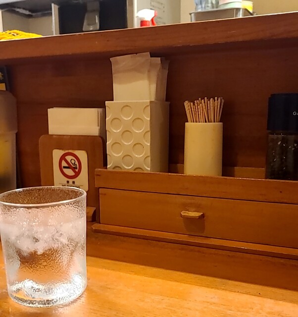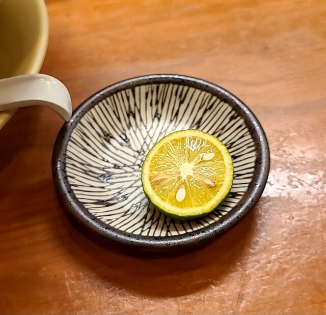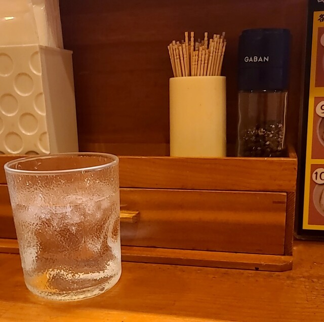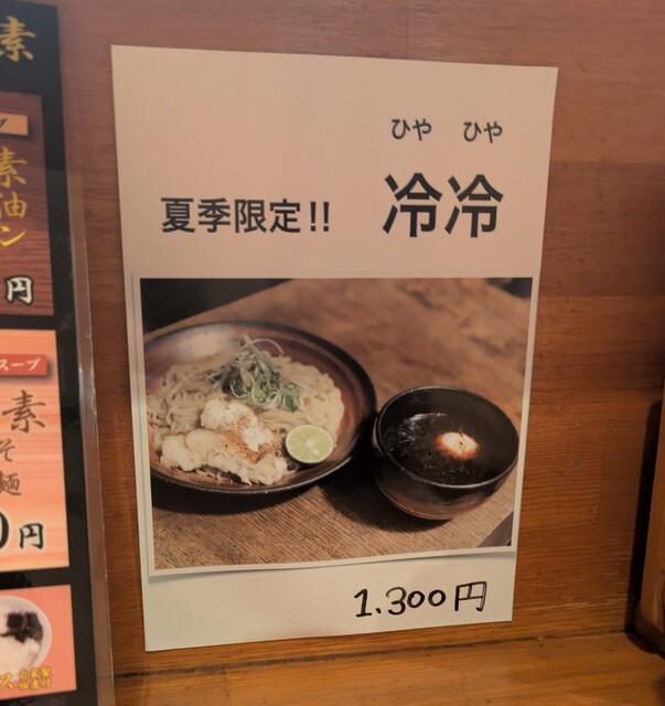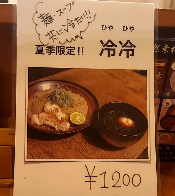 天神祭りでした、なので、天神橋筋六丁目、天満界隈は人でいっぱいです。神輿も商店街練り歩いてる様子です。そんな天満、時間も、夕方5時半過ぎの訪問です。先客数名、外国人観光客もいますね。棚には高麗人参ですね。今回は?夏季限定?冷冷です。麺は水でしっかり〆られた、自家製の中太麺、きれいの盛り付けられて、ネギに、すだち、鶏チャーシューが乗って、スープは冷たい魚介に醤油、バラ海苔が入って、温泉玉子が入ったスープ。頂くと醤油キリッとした冷たい美味しいスープです。麺を潜らせて、冷たい麺に冷たいスープ良く絡んで美味しいです。ネギもスープに投入、麺と一緒に良い食感です。スープの中からメンマです。コリコリ美味しいです。バラ海苔の風味も良いですね。すだち麺に絞って頂いて、冷たい麺更にさっぱりです。温泉玉子も崩して、麺とバラ海苔一緒に絡めてマイルドに。チャーシューは調味料がかかりそのまま頂いて、美味しいです。もう1枚は冷たいスープに潜らせて、温泉玉子にバラ海苔も一緒にこれ又美味しいです。スープ割は無いので、冷たいスープそのまま頂いて、暑い日にぴったりな冷たい美味しい一杯でした。