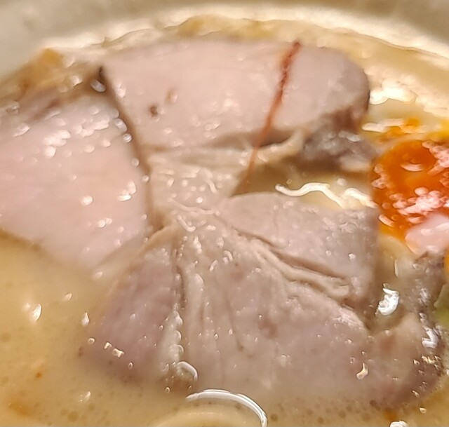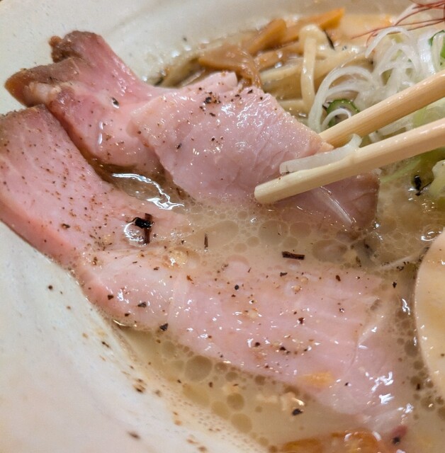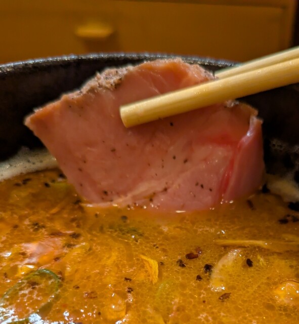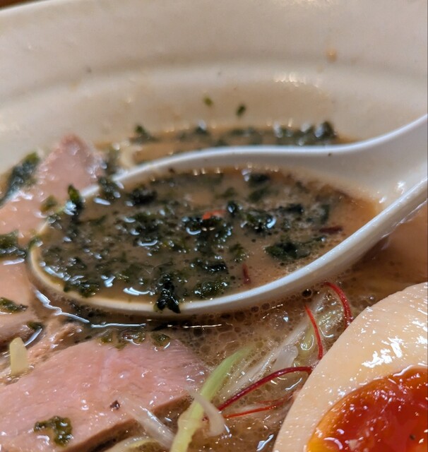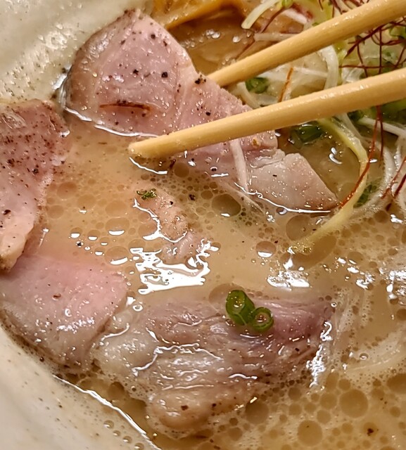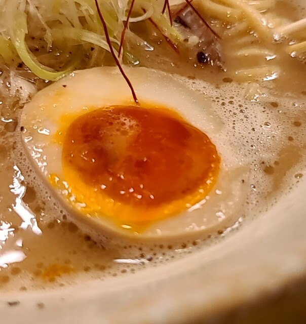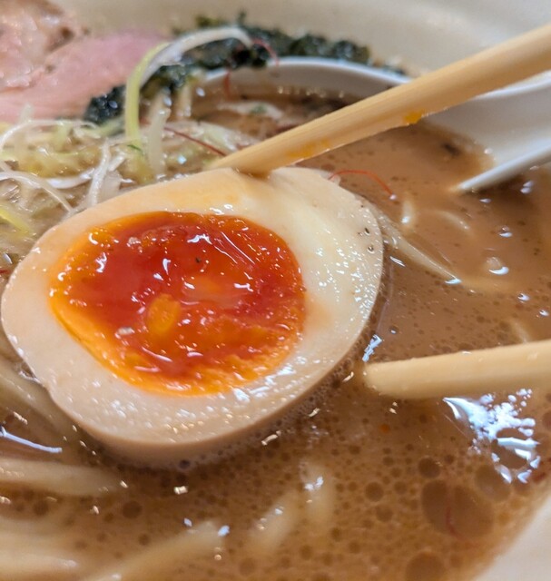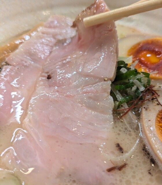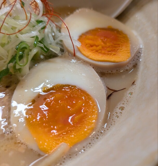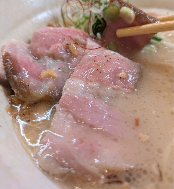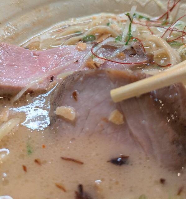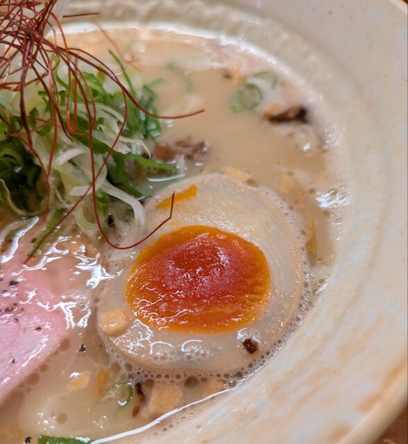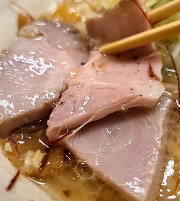 揚げネギも香ばしく、白ネギに糸唐辛子のピリッと感も良いですね。メンマもコリコリ美味しいです。味玉半玉、程よい味付、低温調理のレアチャーシュー、肉肉しく歯ごたえ良く美味しいです。