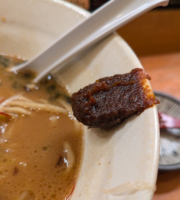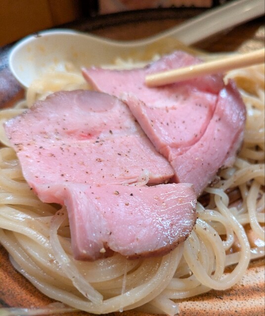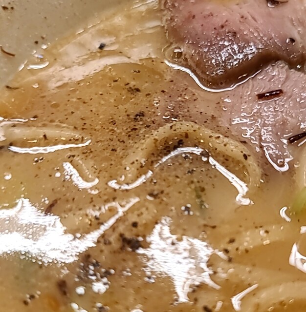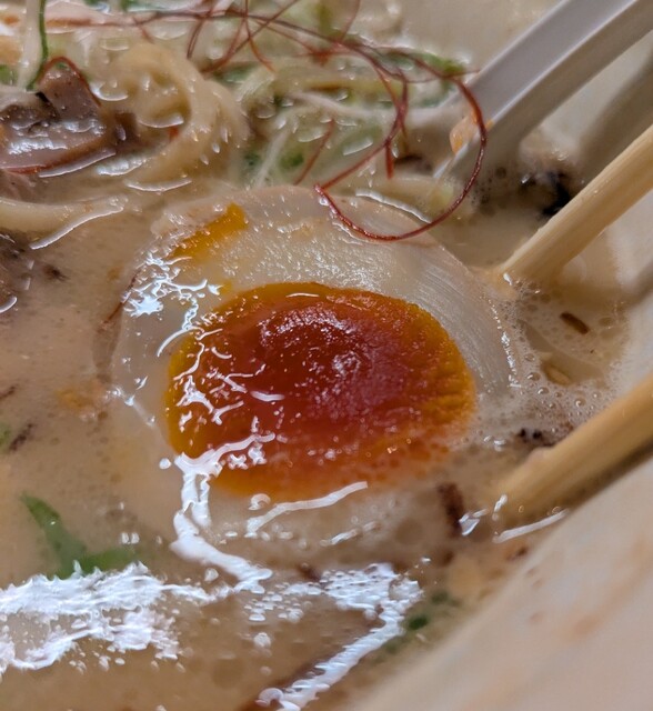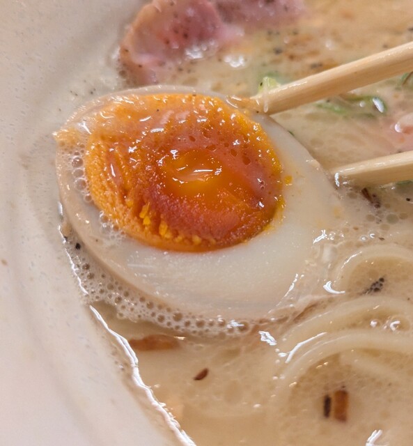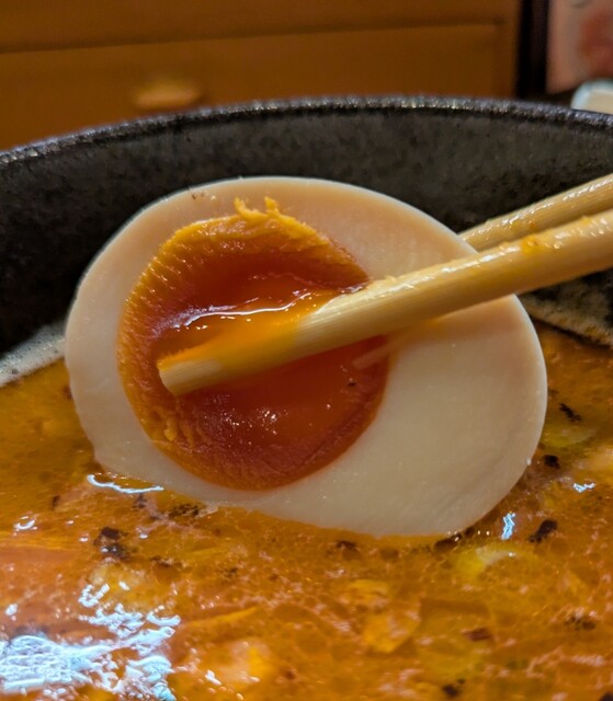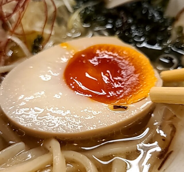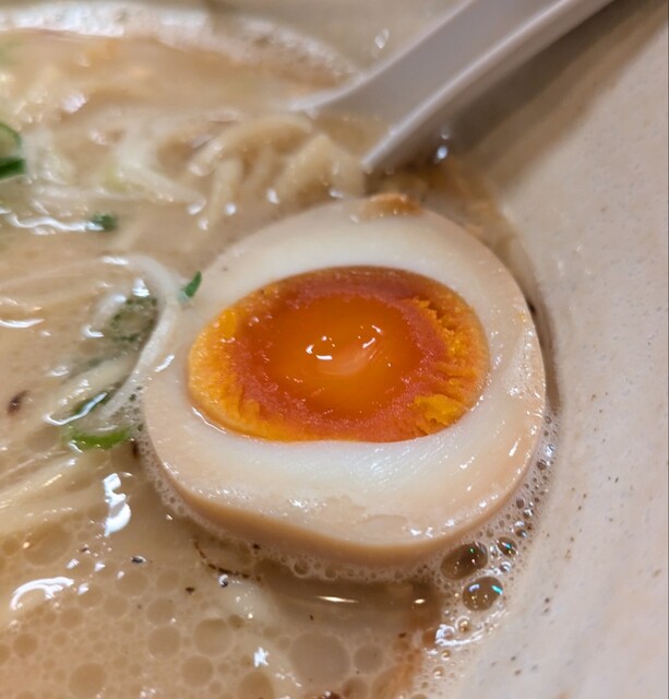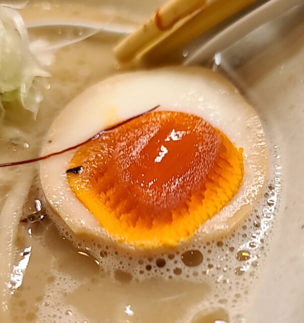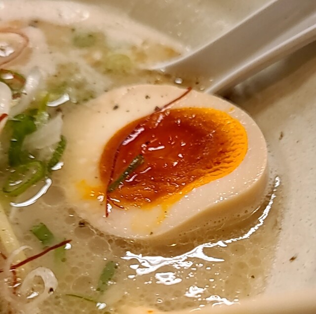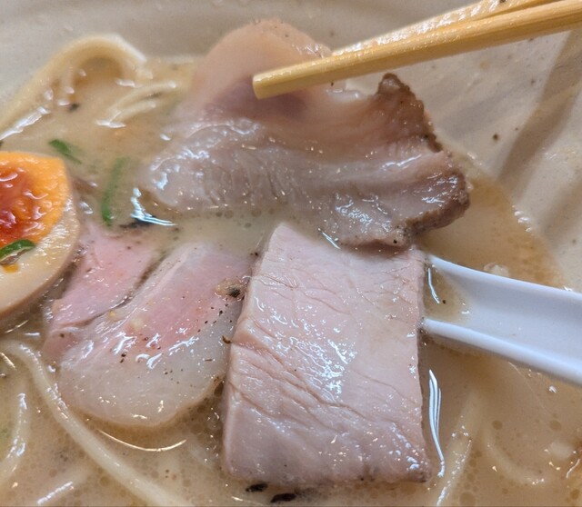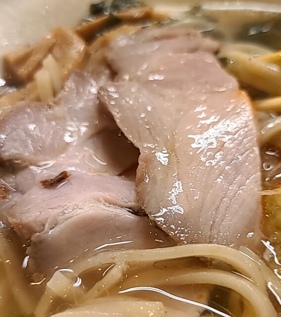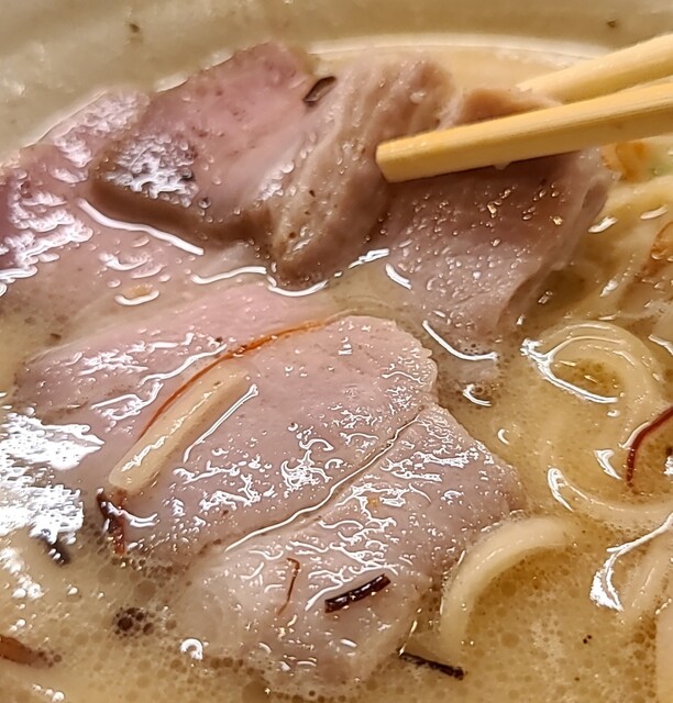揚げネギも香ばしく、白ネギに糸唐辛子のピリッと感も良いですね。メンマもコリコリ美味しいです。味玉半玉、程よい味付、低温調理のレアチャーシュー、肉肉しく歯ごたえ良く美味しいです。