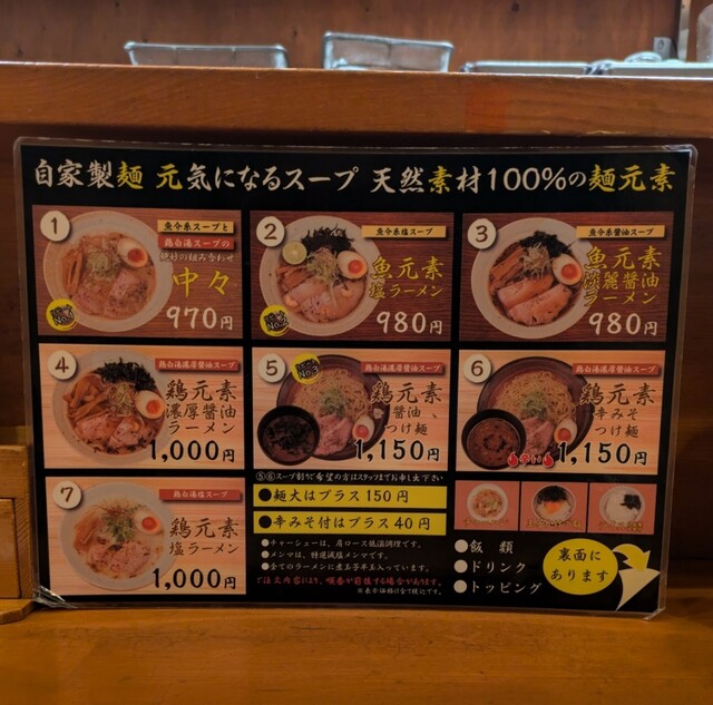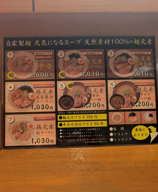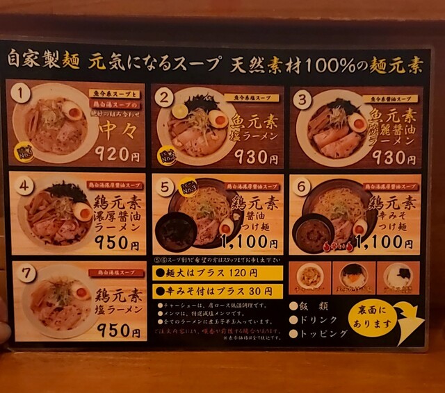 店内は結構な賑わいです。今回のメニューは?鶏元素塩ラーメンです。もちろん辛みそ付きで頂いて。麺元素のあっさり鶏白湯、優しい塩たれを合わせて、あっさりですが深い美味しいスープ、自家製の中細麺、朝鮮人参が入った鶏白湯スープが良く絡んで美味しいです。青ネギに白ネギの食感も良く、糸唐辛子ちょいとピリッと、メンマもコリコリ美味しいですね。味玉半玉、黄身の味付けもちょうど良く美味しいです。レアチャーシュー、歯ごたえ良く肉肉しくこれ又美味しいです。もちろん辛みそ、コチュジャンかなぁ?最初甘くて後でピリッと、鶏白湯スープ良く合って美味しいです。朝鮮人参の入った体に良さそうな美味しい一杯でした。