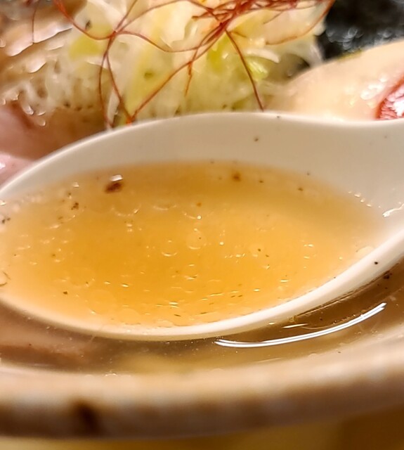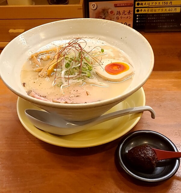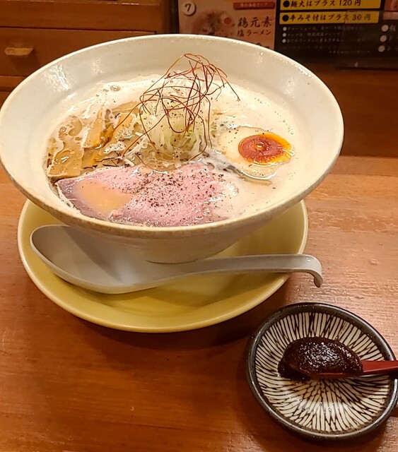 寒さ増して日が落ちるのも早くなり5時過ぎにはもう暗くなて来てるそんな夕方の天満界隈です。そろそろ飲みに行かれる方々も多い時間帯です。店内に、ノーゲストでしたが、その後はどんどんお客さんです。今回は?鶏元素塩ラーメンです。もちろん辛みそも一緒に、スープは優しい鶏白湯に高麗人参と塩タレを合わせたまったり鶏白湯スープ、あっさりしてますが鶏の旨味しっかり美味しいスープです。麺は自家製の中細麺、腰も強く喉越し良く、鶏白湯塩スープが良く絡んで美味しいです。揚げネギも香ばしく美味しいです。青ネギに白ネギの食感も良く、糸唐辛子がちょいとピリッと良いですね。メンマもコリコリ美味しいです。味玉半玉、黄身とろとろ味付もちょうど良く美味しいです。頂いた辛みそ投入、最初ほんのり甘くて後でピリッ、鶏白湯辛みそスープに。レアチャーシュー2枚、肉々しく歯ごたえ良く、肉の旨味もしっかり、これ又美味しいチャーシューです。まったり鶏白湯にピリッと辛みその美味しい一杯でした。