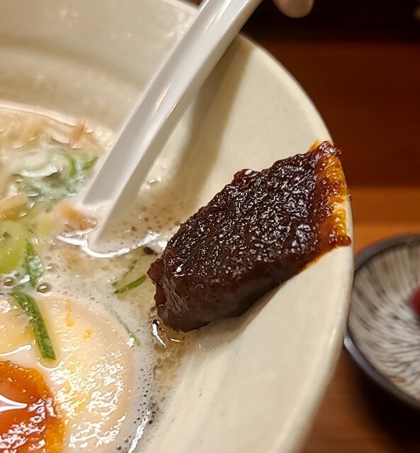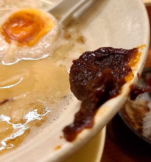 トッピングして増量した味玉、黄身もとろとろ美味しいですね、レアチャーシュー、肉肉しく、歯ごたえ良く美味しいです。別皿の辛みそ投入。コチュジャンのような最初甘くて後から辛い、鶏白湯スープと良く合って美味しいですね。