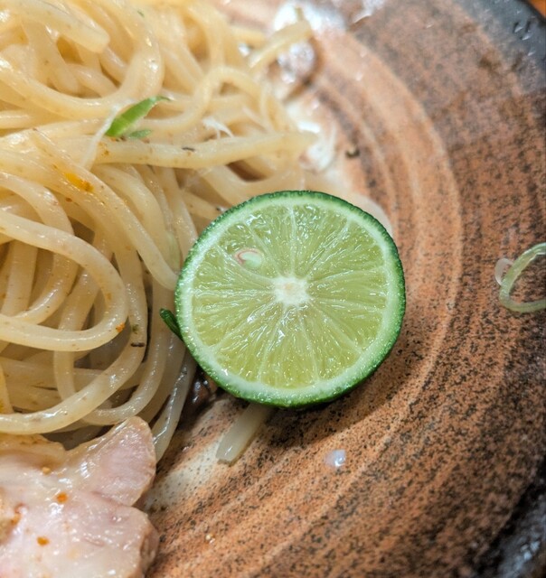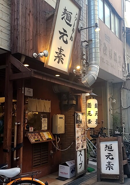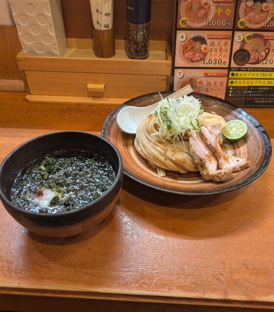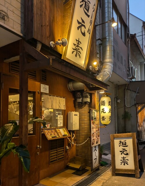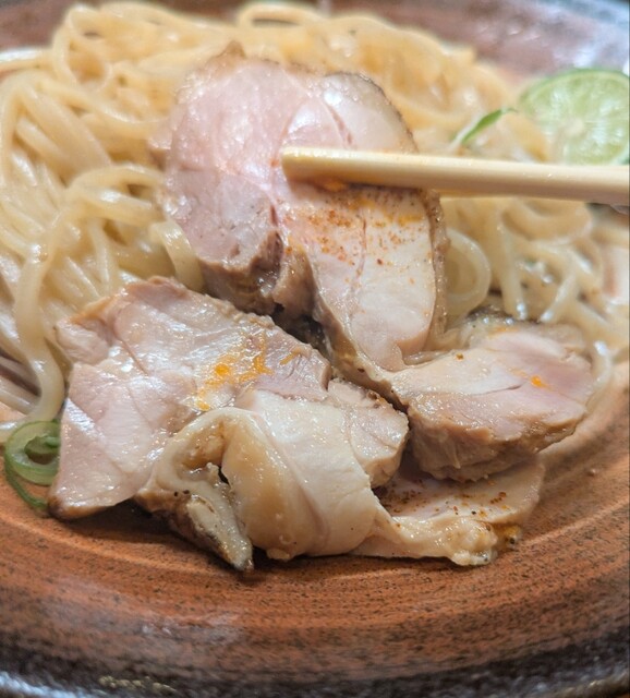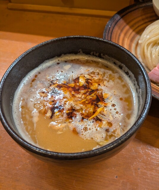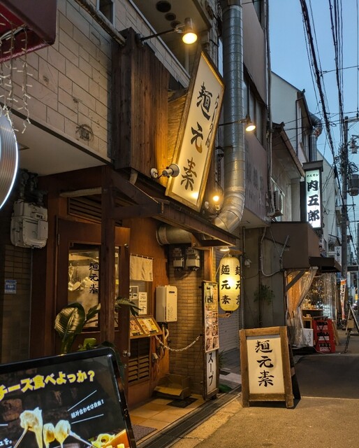 梅田で用事を済ませて、ちょいと寄り道してしてからも、時間も夜の7時半です。天神橋筋六丁目、天満界隈です。店内は先客数名、棚には高麗人参ですね。今回は?鶏元素辛みそつけ麺です。久々ここのつけ麺。麺は自家製の中太麺、上にはネギに味玉半玉、レアチャーシュー2枚です。スープは鶏白湯に辛みそを合わせて、表面には辣油、揚げネギが入って。スープ辛みそ頂いて、鶏白湯のコクに辛みそがピリッと濃厚で美味しいスープです。自家製の中太麺、スープに潜らせて頂いて、中太麺に鶏白湯辛みそスープが良く絡んで、辛い美味しいです。ネギの食感も良く、スープの中からメンマです、コリコリ美味しいですね。味玉半玉、黄身も程よく味付けもちょうど良く美味しいですね。レアチャーシュー2枚肉々しく歯ごたえ良くこれ又美味しいです。麺を食べ終えるともちろんスープ割です。熱々に温められて、辛さそのまま、ちょうど良い濃さに、辛い美味しいスープ割です。鶏白湯辛みその美味しい一杯でした。