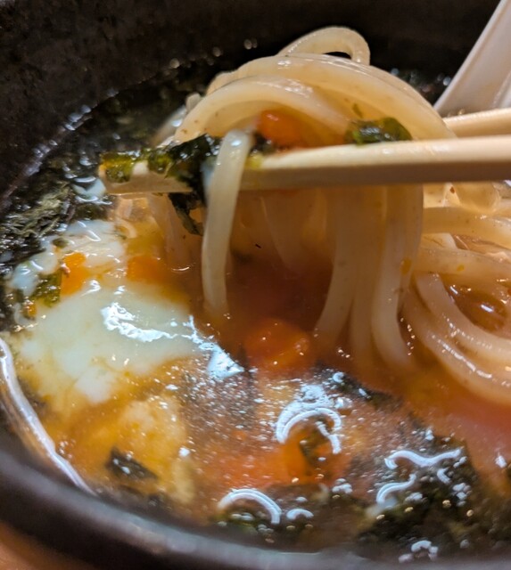 中々です。辛みそ付きで頂いて、スープは鶏白湯に魚介を合わせた白濁したスープ、醤油たれと塩たれを合わせて。あっさり優しい美味しいスープ、麺は自家製の中太麺、魚介鶏白湯スープが良く絡んで美味しいですね。白ネギの食感も良く、糸唐辛子もピリッと美味しいです。揚げネギの風味も香ばしく美味しいです。メンマも多めに入ったコリコリ美味しいです。味玉半玉、味つけも程よく美味しいですね。レアチャーシュー、肉肉しく歯ごたえ良くこれ又美味しいですね。途中から辛みそ投入です。コチュジャンのような?最初甘くて後でピリッと。溶かして味変美味しいです。朝鮮人参の入った体にもよさそうな美味しい一杯でした。