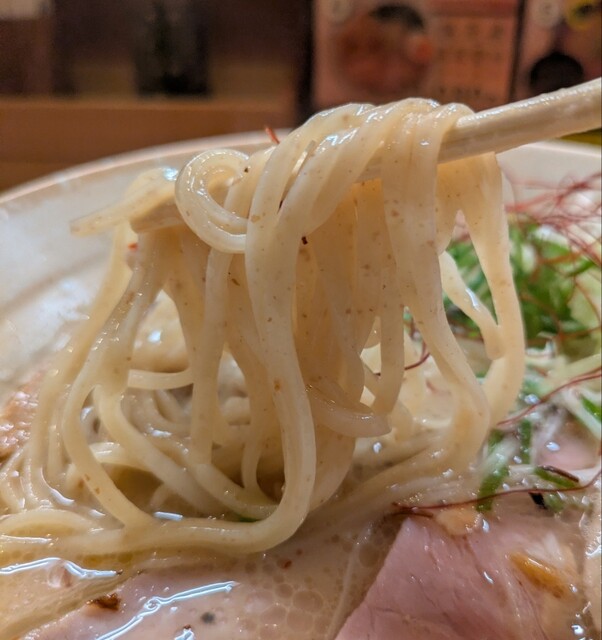 自家製の中細麺、鶏白湯魚介スープが良く絡んで美味しいですね。