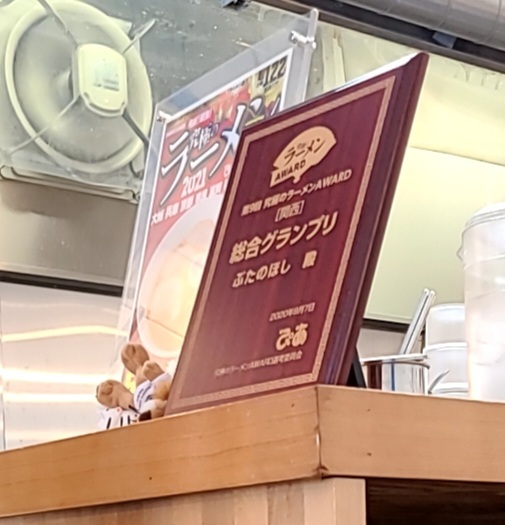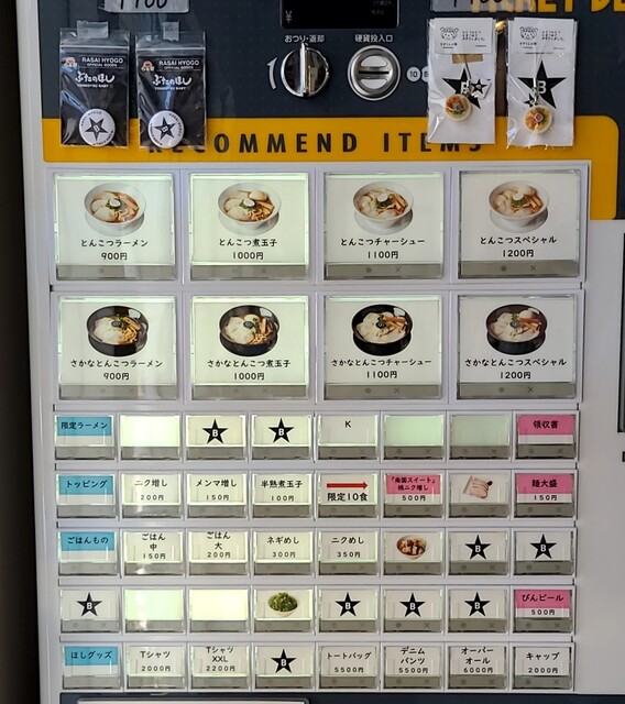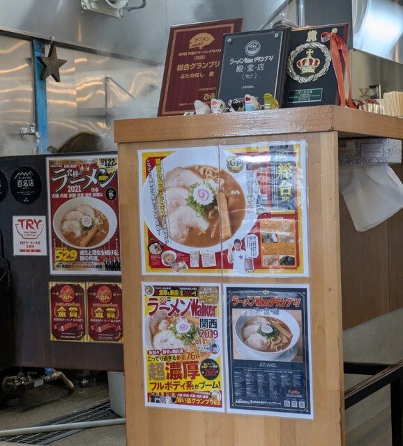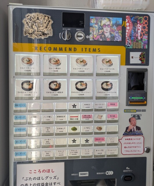 休日のお昼ご飯です。JR尼崎です。このあたりもかなりきれいになりましたね、キューズモールもありかなり賑わってますが?時間も午前10時半です、尼崎駅からちょいと歩いて、繁華街から少し離れたところですね。時間も午前10時36分到着です。店内はすでに9名程、中で行列が出来てる様子です。店内に、券売機で食券買って行列に並びます。オーブン、1巡目で座れました。今回は?数量限定の?KAKE2です。幻の限定頂けました。半熟煮玉子に贅沢な桃にく皿PREMIUMも頂いて、名前の通り、濃厚とんこつスープに細麺です。豚骨と水だけで取られた、濃厚スープですが、くどく無く豚骨の旨味がダイレクトに味わえる美味しいスープ、細麺に濃厚とんこつスープが良く絡んで美味しいです。別皿には、チャーシュー、九条ネギ、ドライトマト塩昆布におにぎりです。トッピングした半熟煮玉子も乗って。先ずはチャーシュー、KAKE2にのせて、豚骨スープを良く絡めて、柔らかくジューシーで美味しいチャーシューです。九条ネギも入れて、良い食感です。ドライトマトに塩昆布も入れて、ドライトマト、酸味甘味豚骨スープの味がしまり美味しいです、塩昆布の塩身もちょうど良く美味しいです。トッピングした半熟煮玉子、黄身とろとろ味付もちょうど良く美味しいです。桃にく皿PREMIUM、3枚に醬油漬けのニンニク添えられて、ニンニク醬油漬け桃にくにくるんで、肉々しくでも柔らかく美味しいです。さらに豚骨スープに潜らせて、これ又美味しいです。麺を食べ終えると、別皿のおにぎり、海苔に辛味噌が乗って、濃厚とんこつスープに投入です。良く混ぜて、海苔の風味に辛味噌ピリッと独特の風味、とんこつスープと良く混ぜて美味しいです。途中で卓上の辛ニラ投入、さらにピリッとこちらも独特の風味がとんこつスープとも良く合いご飯が進む美味しいです。ぶたのほしの貴重な数量限定の美味しい一杯でした。