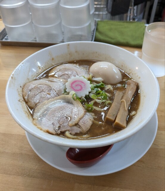 兵庫県尼崎の有名店ですね、時間も午前10時50分到着、すでに大行列です。店内の待合は満席、外にも行列です。最後尾に並んで、待つことに、15分程でやっと中のエアコンのきいてる店内に、券売機で食券を買って待つこと1時間、ようやく席に、一列の長いカウンター、今回は?とんこつ煮玉子です。前回と同じメニューです。スープは鹿児島南国スイートの豚骨を使ったドロドロ濃厚スープ、営業中ずっと煮込まれて、濃厚ですがくどく無い、美味しいスープですね。麺は少し縮れた平打ち中太麺です。濃厚ドロドロ豚骨スープが良く絡んで美味しいですね。青ネギに刻んだ玉葱の食感も良く、極太材木メンマもコリコリ美味しいです。煮玉子も程よい味付け美味しいですね。チャーシュー3枚柔らかいですね。脂身もジューシー美味しいです。卓上の辛みそ入れて、ちょいとピリッとこれ又美味しいです。卓上の辛ニラも投入、これも又違ったピリッと感、これ又美味しいですね。濃厚ドロドロ濃くて美味しい一杯でした。